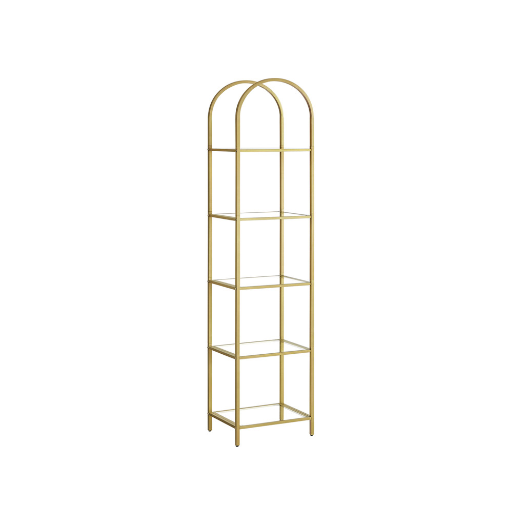 Ez az ívelt kialakítású, arany színű acélvázas polcrendszer ötvözi az elegáns megjelenést a praktikus funkcionalitással. Az 5 átlátszó, edzett üvegpolc tökéletes felületet biztosít dekorációk, könyvek és személyes tárgyak bemutatására, miközben a karcsú dizájn minimális helyet foglal.