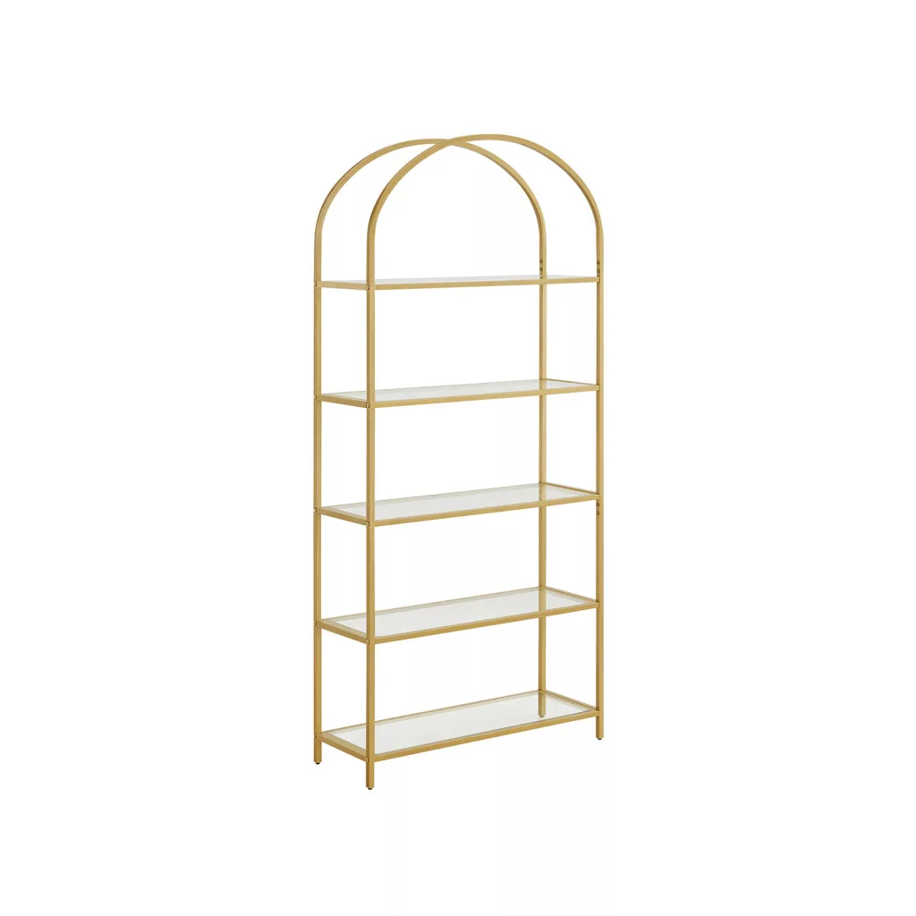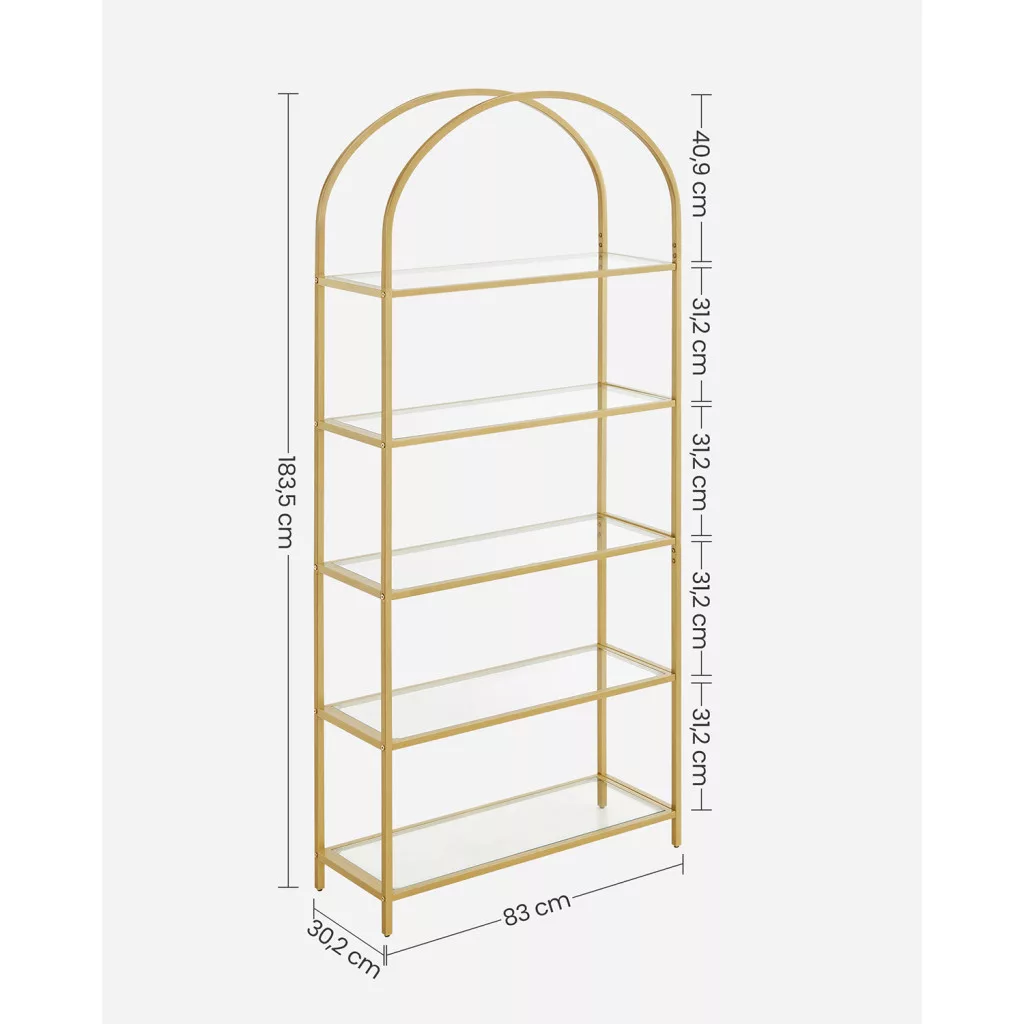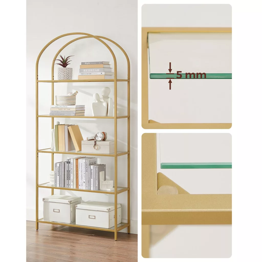 Elegáns, 5 szintes üvegpolcos állvány arany acélvázzal és ívelt dizájnnal, amely tökéletes megoldást nyújt könyvek, dekorációk és személyes tárgyak stílusos tárolására.
