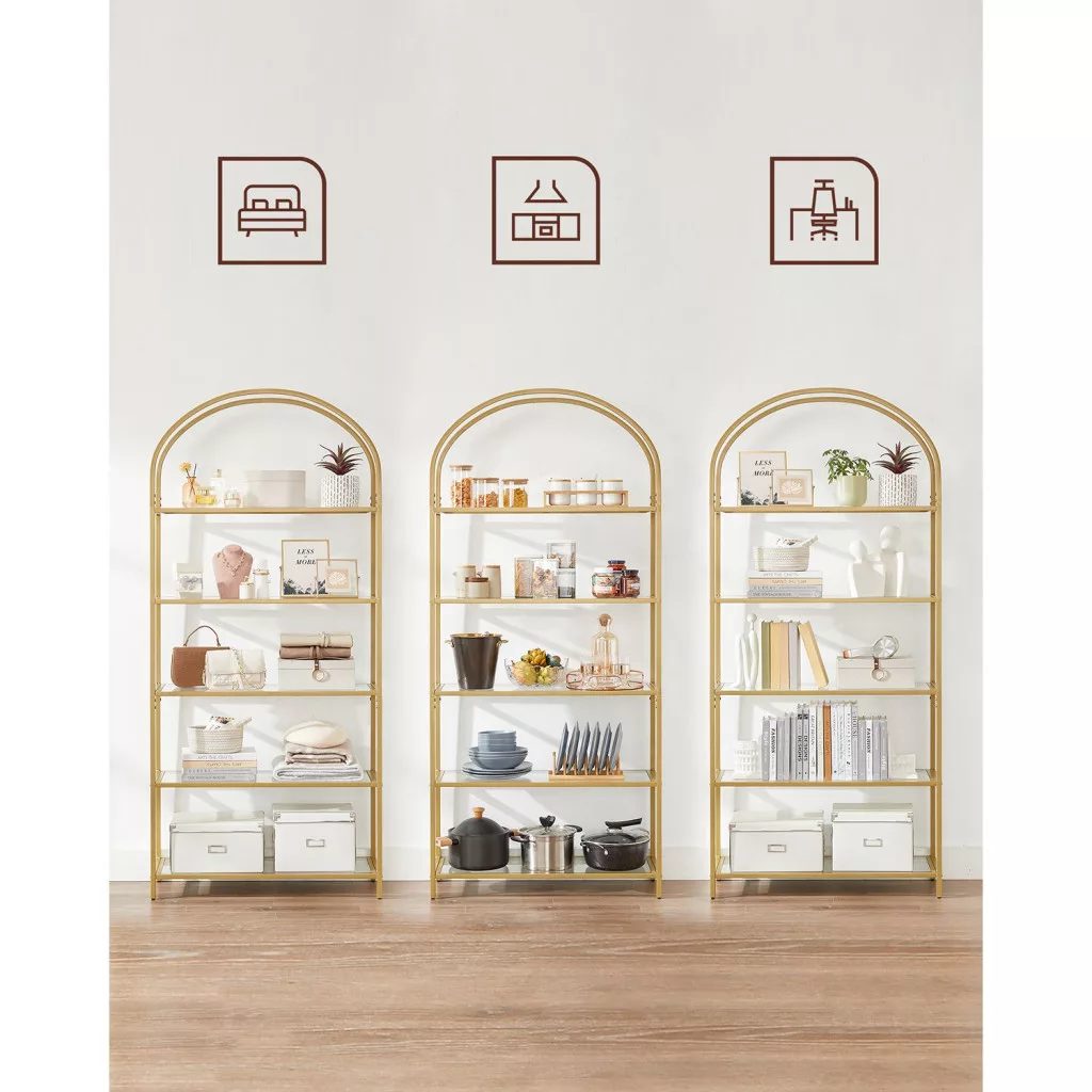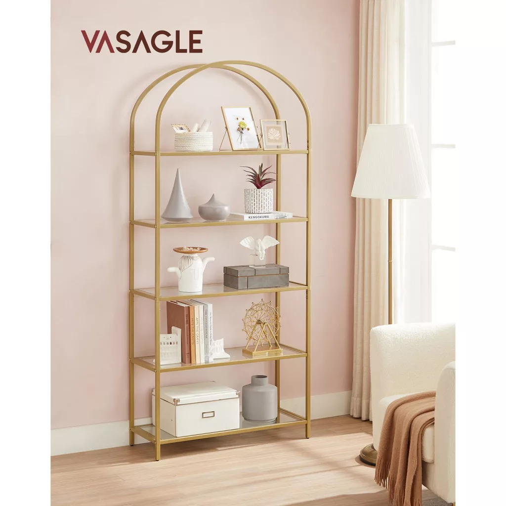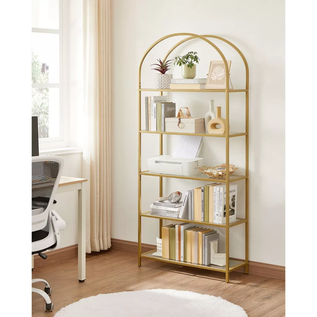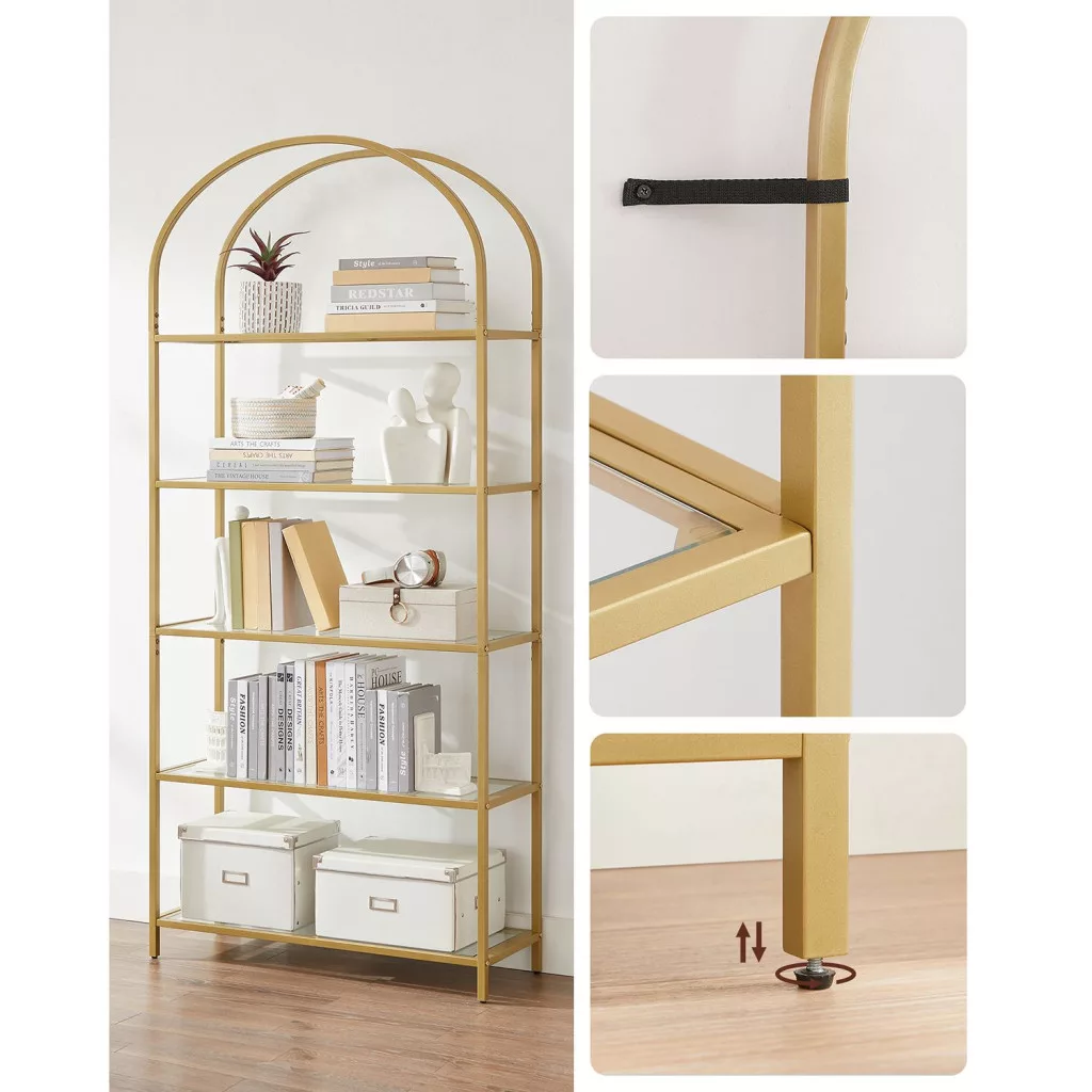 Elegáns, 5 szintes üvegpolcos állvány arany acélvázzal és ívelt dizájnnal, amely tökéletes megoldást nyújt könyvek, dekorációk és személyes tárgyak stílusos tárolására.