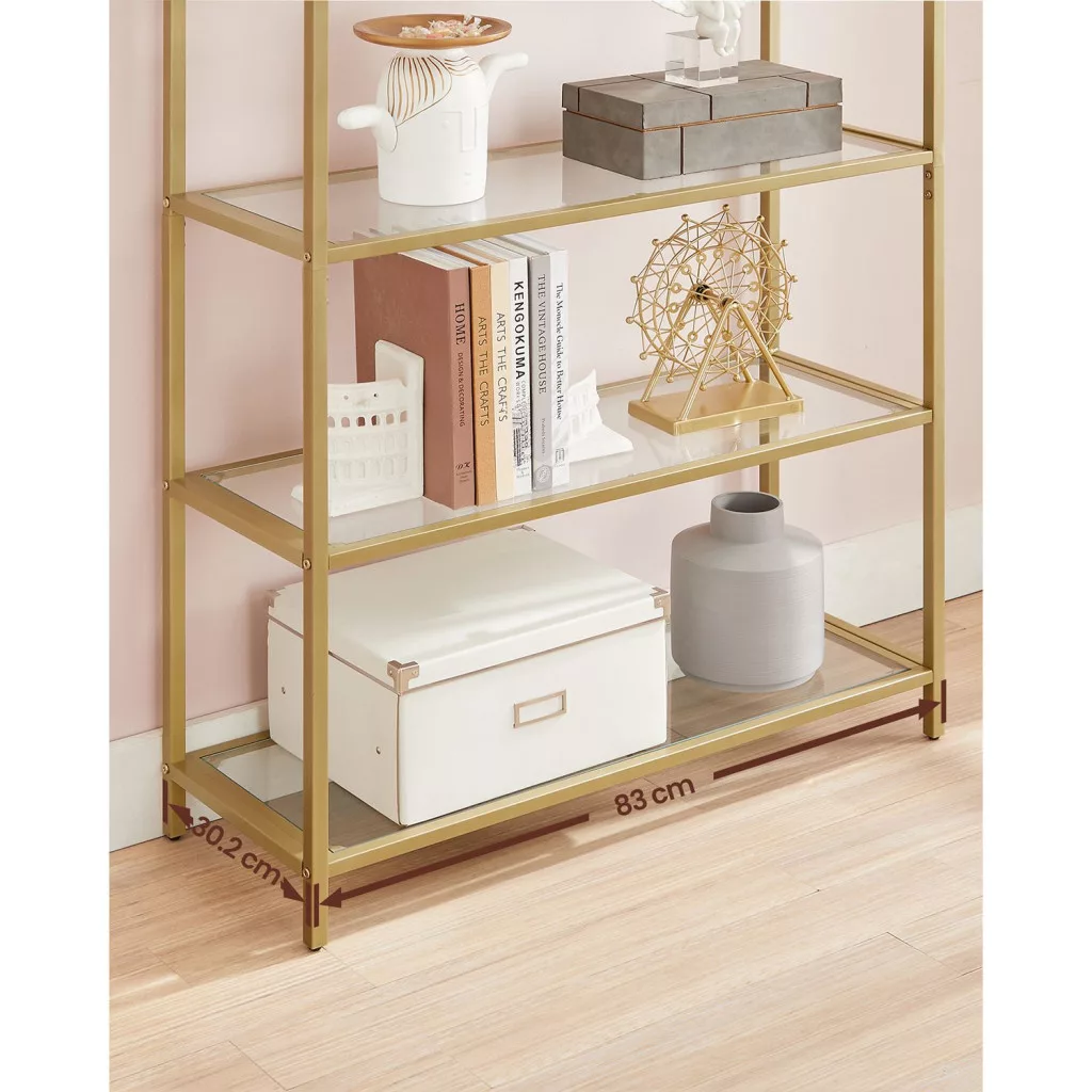 Ez az ívelt kialakítású, arany színű acélvázas polcrendszer egyesíti a modern dizájnt a funkcionalitással. Az 5 edzett üvegpolc elegáns megjelenést kölcsönöz, miközben biztonságos tárolófelületet biztosít könyvek, dekorációs tárgyak és személyes holmik számára.