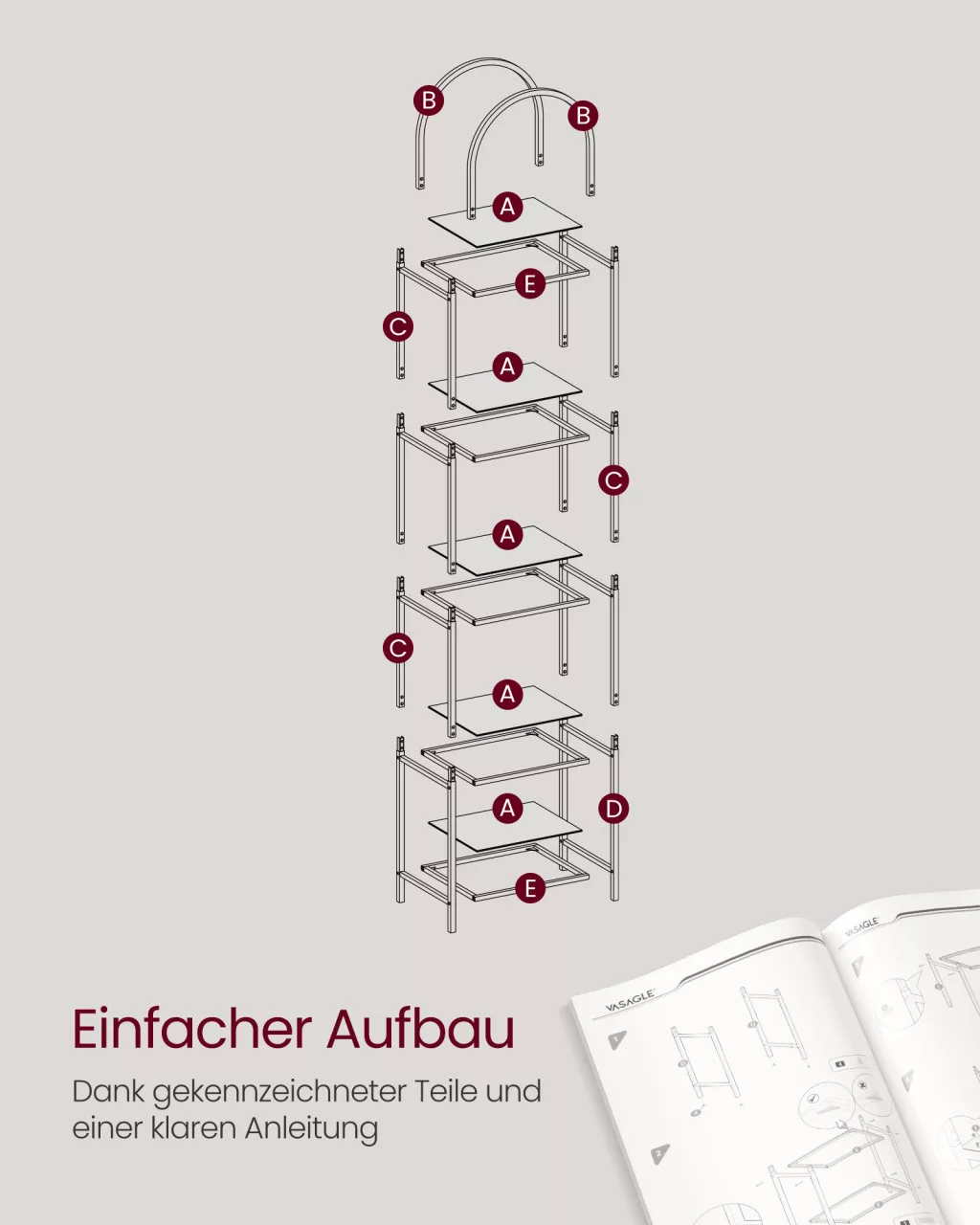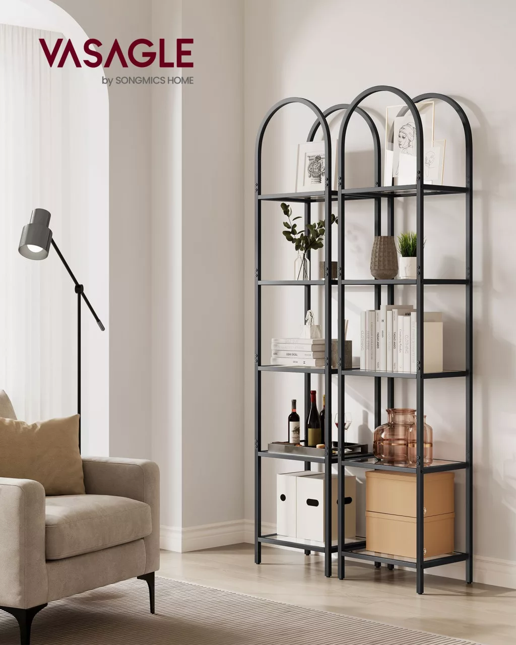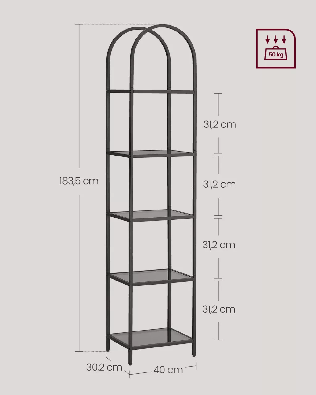 Ez a VASAGLE üvegpolc rendszer egyesíti a funkcionalitást és az esztétikumot. Az ívelt acél keret és a palaszürke edzett üvegpolcok modern eleganciát sugároznak, miközben maximális tárolóhelyet biztosítanak. A polcok között 31,2 cm távolság található, ami lehetővé teszi különböző méretű tárgyak elhelyezését.