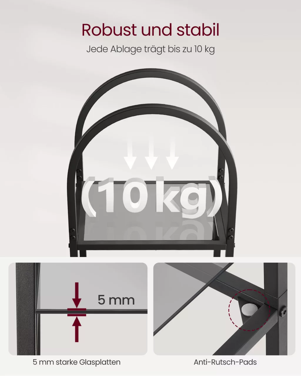 • Stabil szerkezet: 10 kg teherbírású edzett üvegpolcok és masszív acél váz