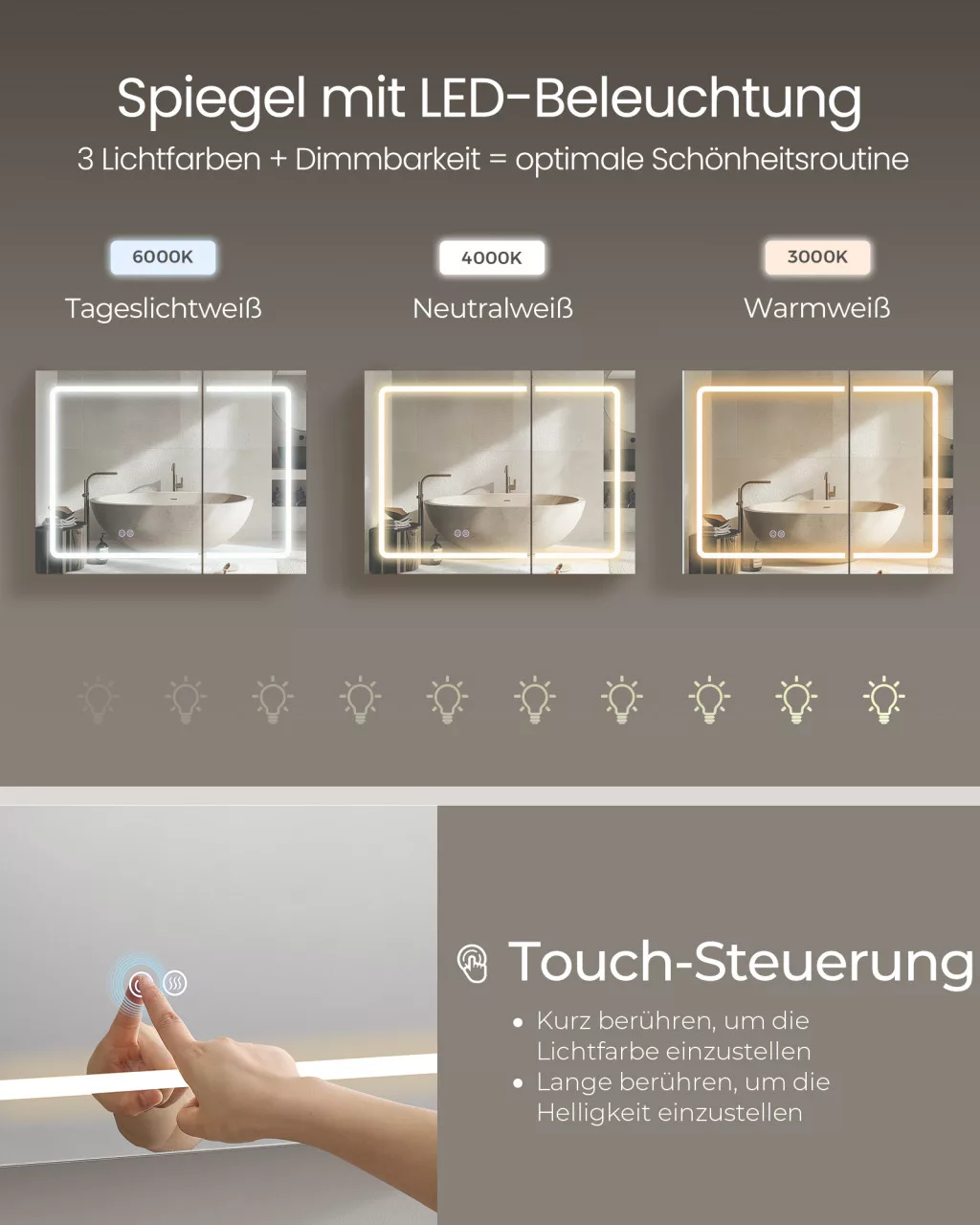 • Érintésvezérelt LED világítás: A fényerő és színhőmérséklet szabályozása egyszerű érintéssel, memóriafunkcióval, amely megjegyzi az Ön preferenciáit és energiatakarékos használatot tesz lehetővé