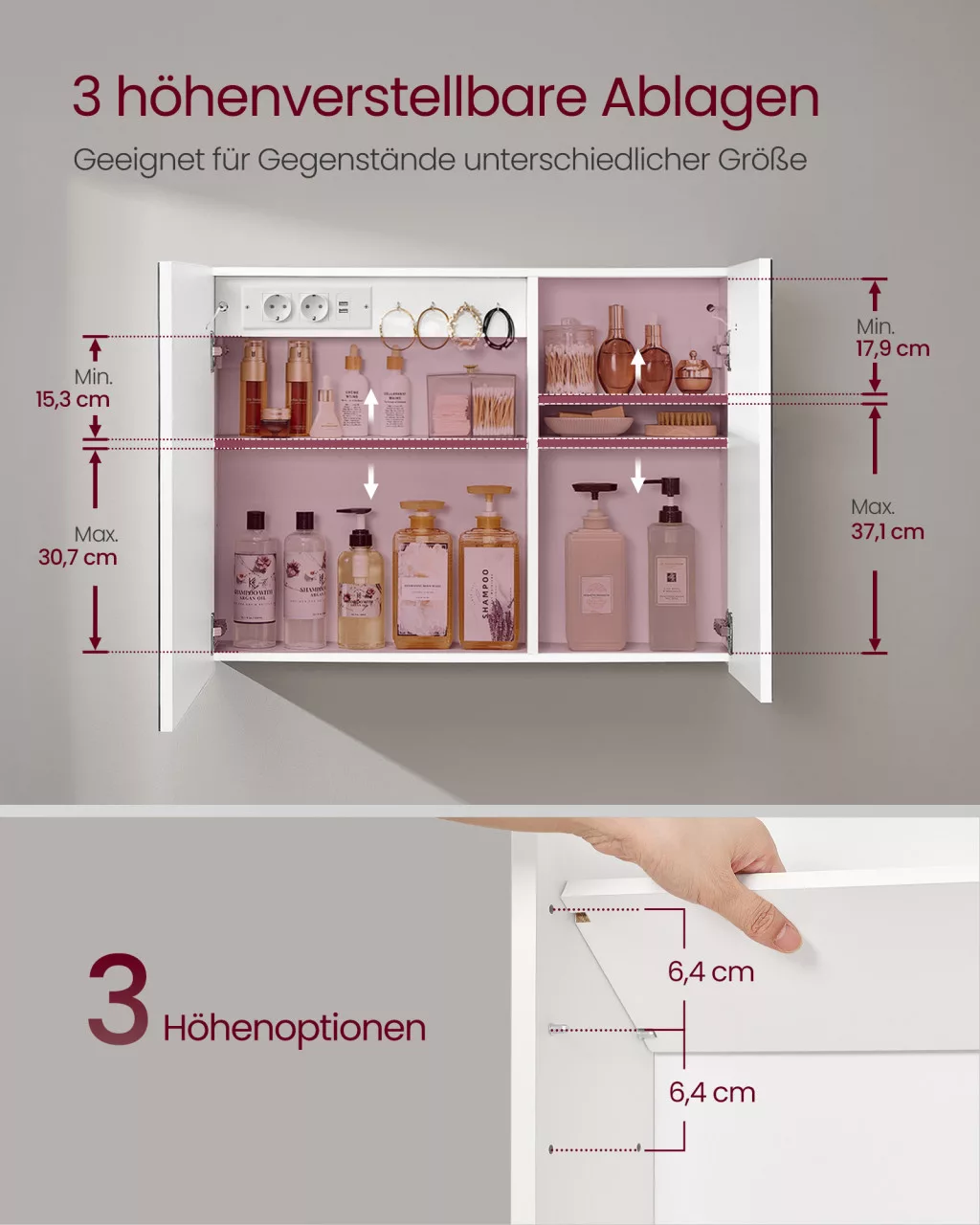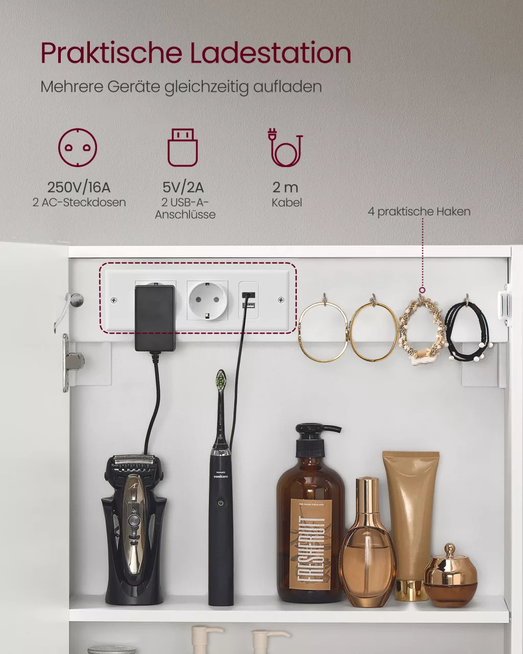 A tükör mögött 4 állítható polc biztosít bőséges tárolóhelyet fürdőszobai kellékei számára, amelyek 3 különböző magasságban pozícionálhatók. A beépített töltőállomás 2 hálózati aljzattal és 2 USB-A porttal felszerelve lehetővé teszi elektromos eszközei, például hajszárító, elektromos fogkefe vagy okostelefon kényelmes töltését. A kiváló minőségű forgácslap és MDF anyagból készült szekrény lakkozott felülettel rendelkezik, amely nemcsak elegáns megjelenést biztosít, hanem könnyen tisztítható is. A 16,5 cm mélységű szekrény 15 kg terhelhetőségű, így biztonságosan tárolhatja fürdőszobai termékei.