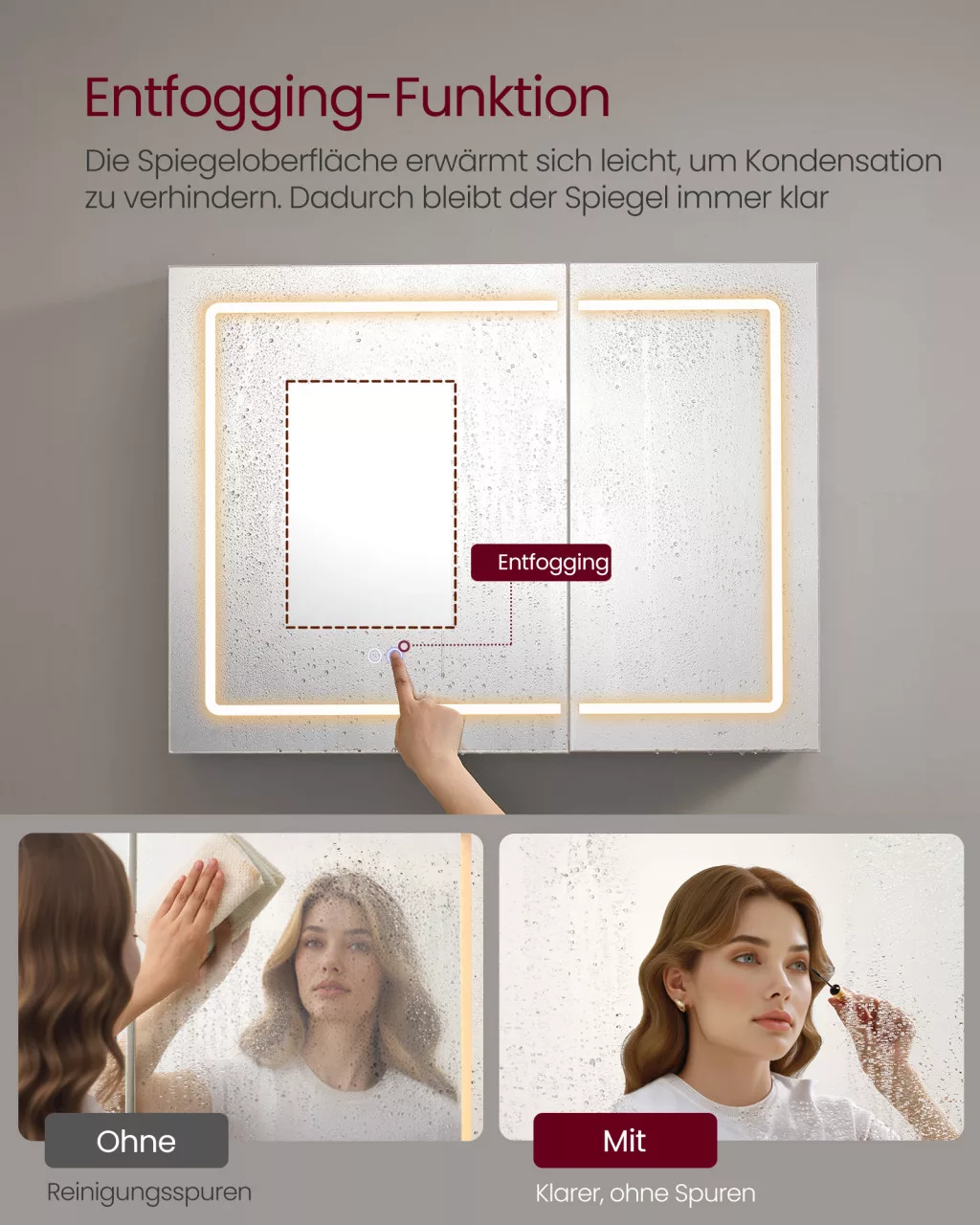 • Páramentesítő rendszer: A beépített fűtőfunkció megakadályozza a tükör bepárásodását zuhanyzás után, így mindig tiszta tükörfelületet biztosít