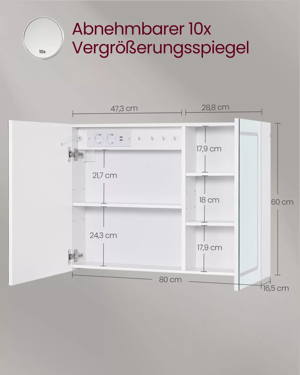 Modern fürdőszobai tükrös szekrény beépített LED világítással, páramentesítő funkcióval és praktikus töltőállomással. A fehér kivitelű szekrény 4 állítható polcot és 10x-es nagyító tükröt kínál a kényelmes tároláshoz és használathoz.