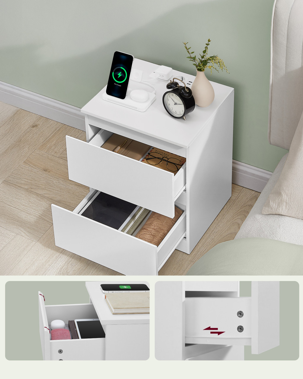 Az éjjeliszekrények nemcsak stílusosak, hanem rendkívül praktikusak is. A két tágas fiók (30 x 40 x 8,5 cm) bőséges tárhelyet kínál személyes tárgyaid számára, így a hálószobád mindig rendezett maradhat. A kiváló minőségű lapokból készült bútor 50 kg-ig terhelhető a felső felületen, míg minden fiók 4,7 kg-ot bír el. A prémium zsanérok és a lekerekített élek könnyűvé teszik a fiókok nyitását, az összeszerelés pedig egyszerű és gyors a jól jelölt alkatrészeknek és a könnyen követhető útmutatónak köszönhetően.