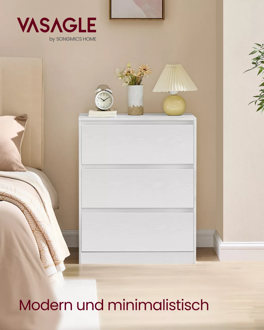 VASAGLE KAILYN fiókos szekrény hálószobába 3 fiókkal hófehér