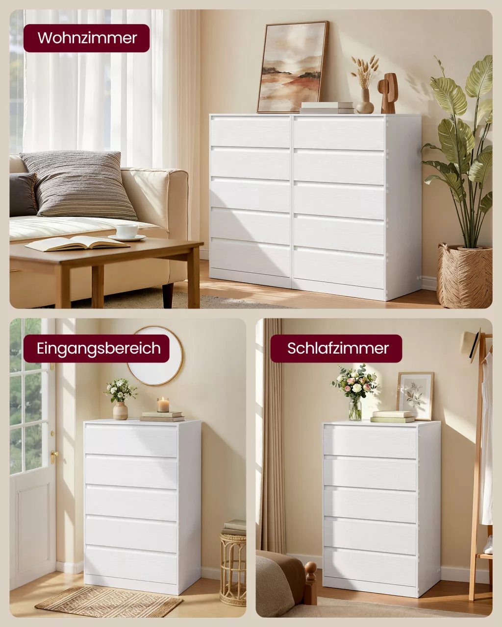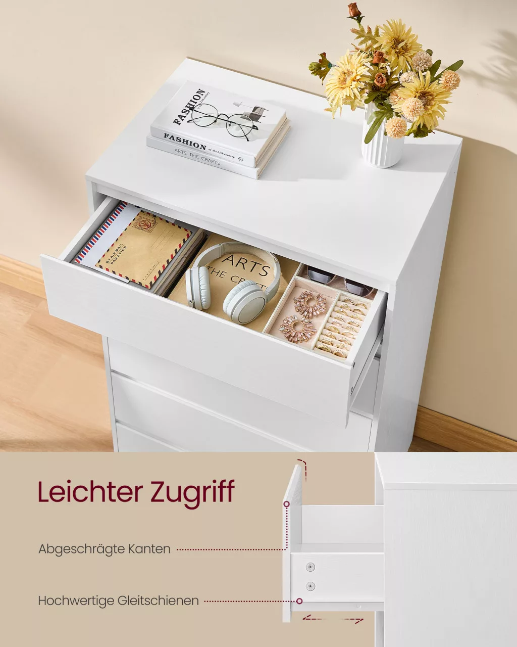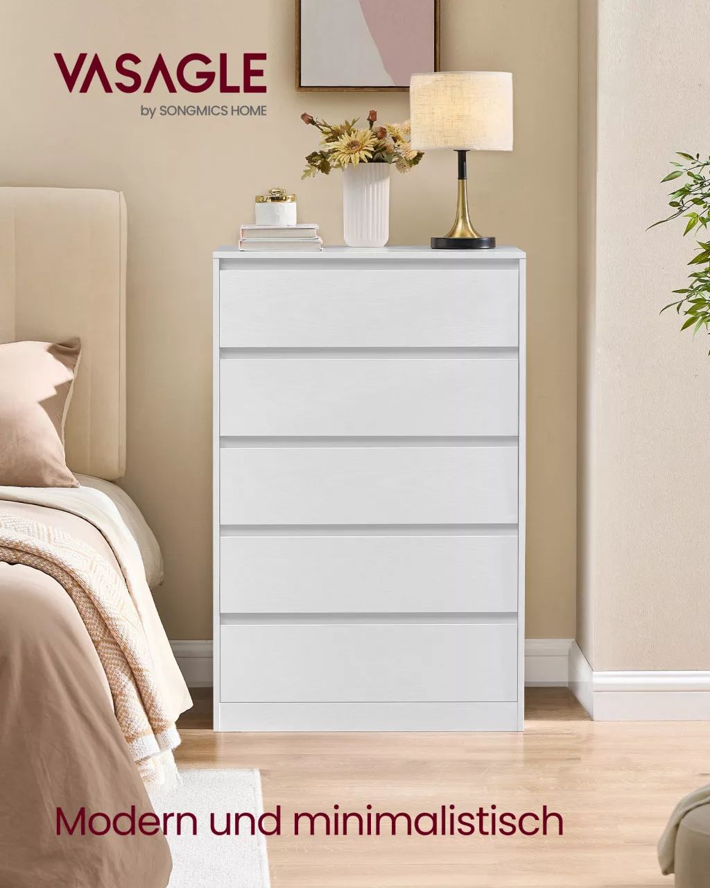 A VASAGLE KAILYN kollekció modern, minimalista fiókos szekrénye tökéletes megoldás a hálószobai tárolásra. Öt tágas fiókjával rengeteg helyet biztosít ruházat, fehérnemű és kiegészítők rendezett elhelyezésére, miközben letisztult, fogantyú nélküli designja harmóniát teremt otthonában.