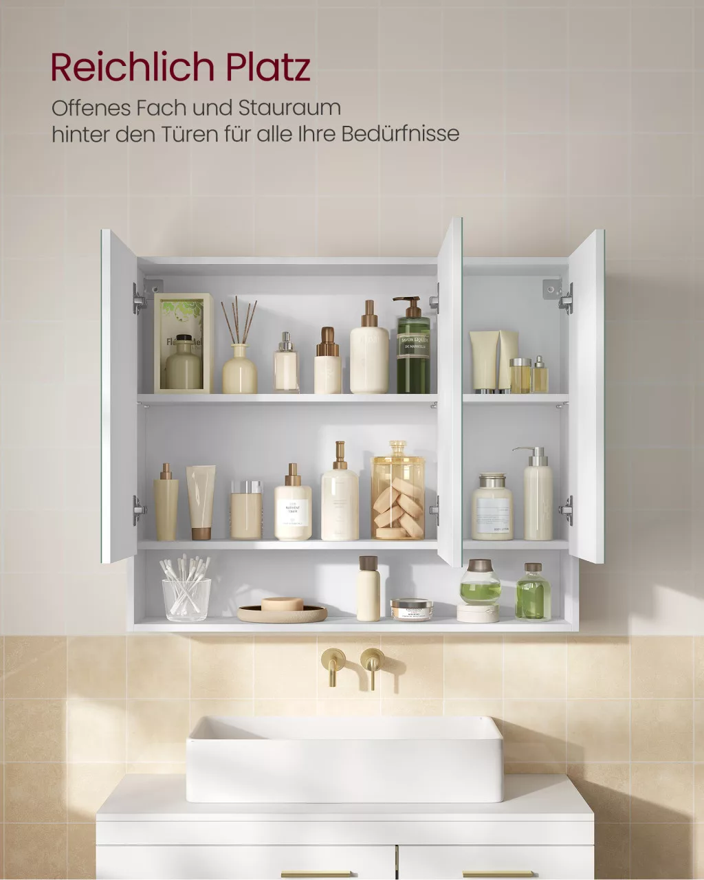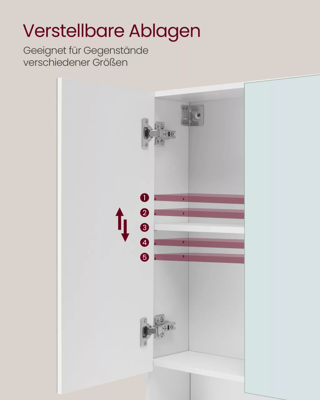 • Állítható polcok a zárt rekeszekben, amelyek rugalmas tárolást biztosítanak különböző méretű fürdőszobai termékek számára