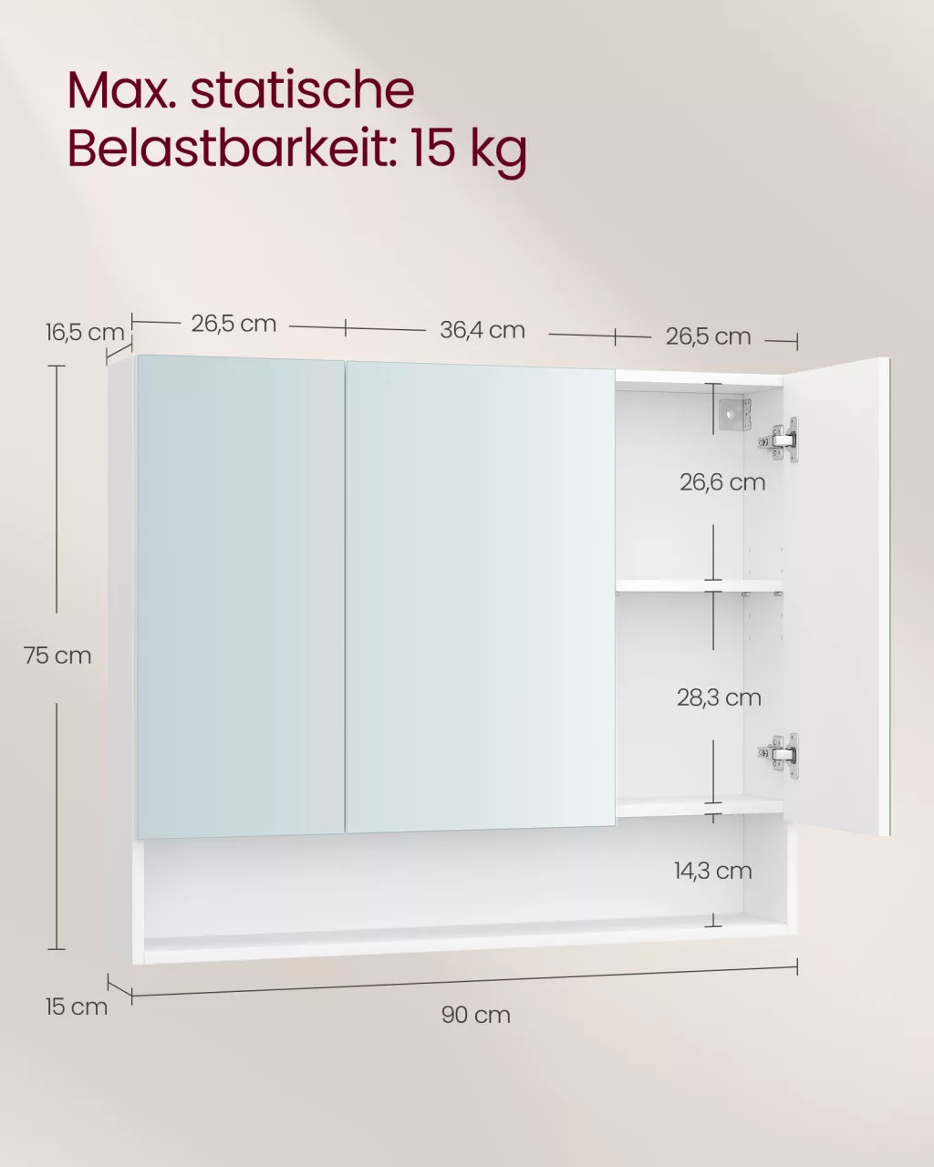 A VASAGLE KAILYN kollekció tükrös fali szekrénye a funkcionalitás és az esztétika tökéletes ötvözete. A három széles tükrös ajtó mögött tágas, zárt tárolórekeszek rejlenek állítható polcokkal, amelyek lehetővé teszik, hogy különböző méretű fürdőszobai kellékeket rendezetten tároljon. A szekrény alján található nyitott rekesz további tárolási lehetőséget kínál a gyakran használt tárgyak számára, miközben dekoratív elemekkel is feldobhatja fürdőszobája hangulatát.