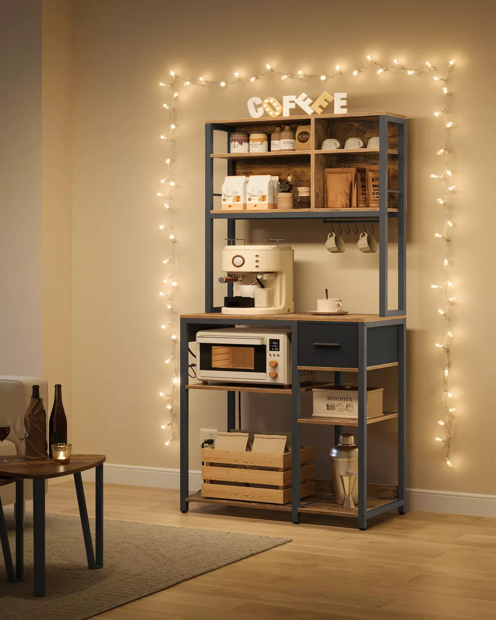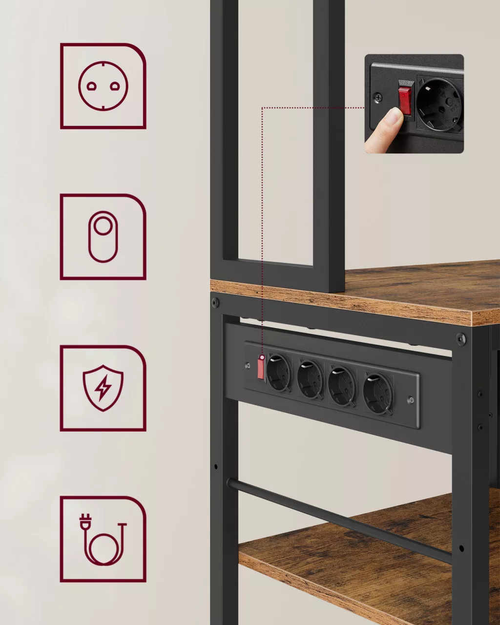 A VASAGLE KKS015K03 konyhai polcrendszer nem csupán egy tárolóbútor, hanem a konyha szívévé válik. A rusztikus barna és tintafekete színkombináció modern ipari stílust kölcsönöz, miközben a 180 cm magas konstrukció maximálisan kihasználja a függőleges teret. A beépített 4 aljzatos elosztó 3680 watt teljesítményt támogat, túlterhelés- és áramvédelemmel, így biztonságosan használhatja kedvenc konyhai eszközeit.