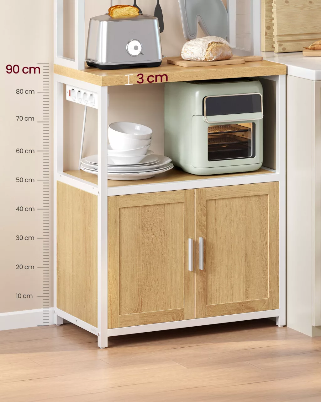 Praktikus konyhai tárolóállvány beépített 4-es elosztóval, ergonomikus 90 cm-es munkafelülettel és 8 akasztóval. Tökéletes megoldás kávésarok kialakításához vagy mikrosütő elhelyezéséhez.