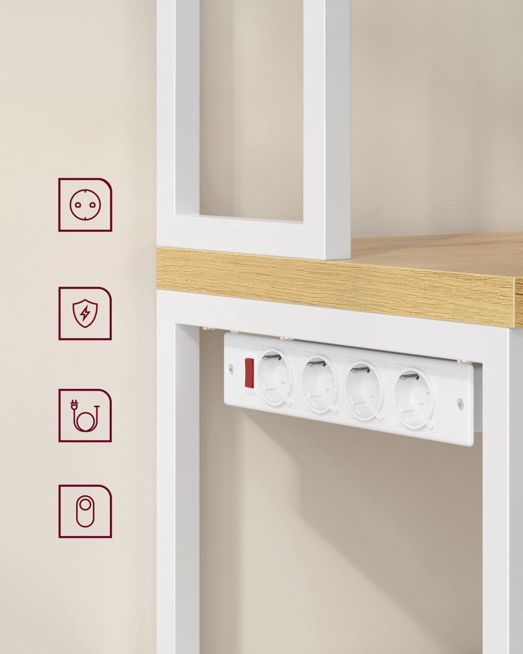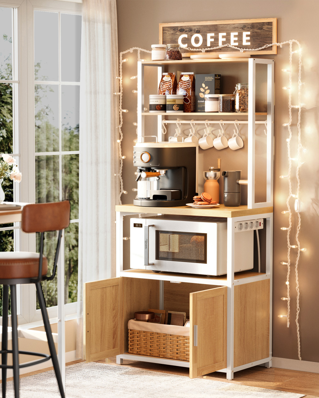 A beépített 4-es elosztó kapcsolóval és túlterhelés-védelemmel felszerelve lehetővé teszi kis konyhai eszközök biztonságos csatlakoztatását. A polcrendszer 8 akasztót kínál csészék tárolására, tágas polcokat fűszereknek, kávéfőzőnek és mikrosütőnek, valamint egy zárt szekrényt nagyobb eszközök és edények számára. A forgácslap és acél konstrukció stabilitást garantál, az állítható lábak pedig egyenetlen talajon is biztosítják az egyensúlyt.