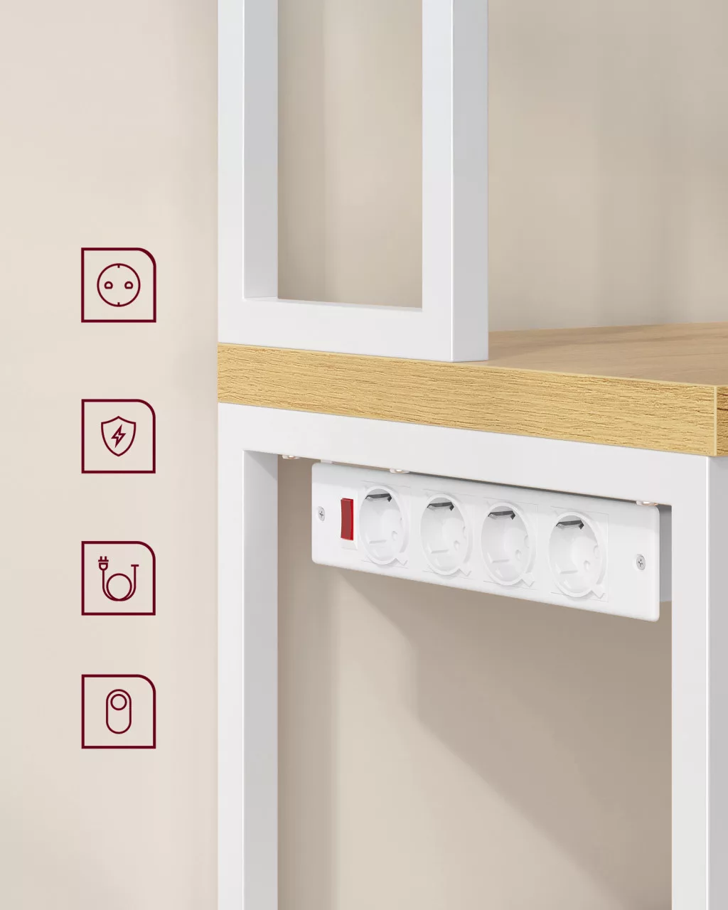 • Beépített 4-es elosztó kapcsolóval és túlterhelés-védelemmel, amely biztonságos áramellátást nyújt konyhai kisgépeknek, és bal vagy jobb oldalra is telepíthető