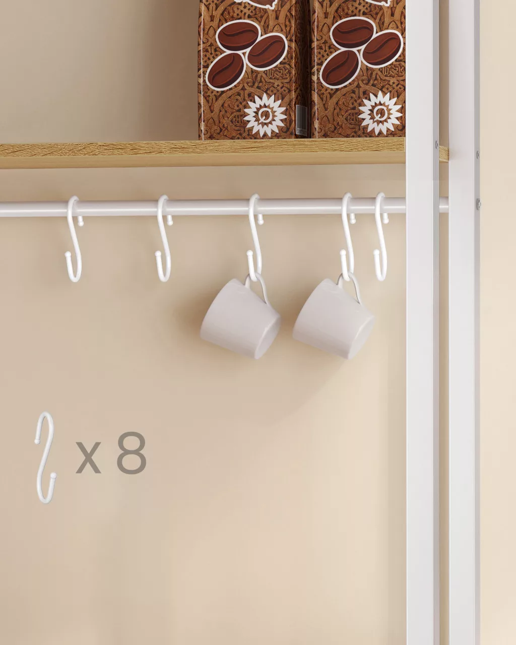 • Többszintű tárolórendszer: A felső polcok fűszereknek, a 8 akasztó csészéknek, a középső rész kávéfőzőnek, az alsó polc mikrosütőnek, a zárt szekrény pedig nagyobb eszközöknek és edényeknek biztosít helyet