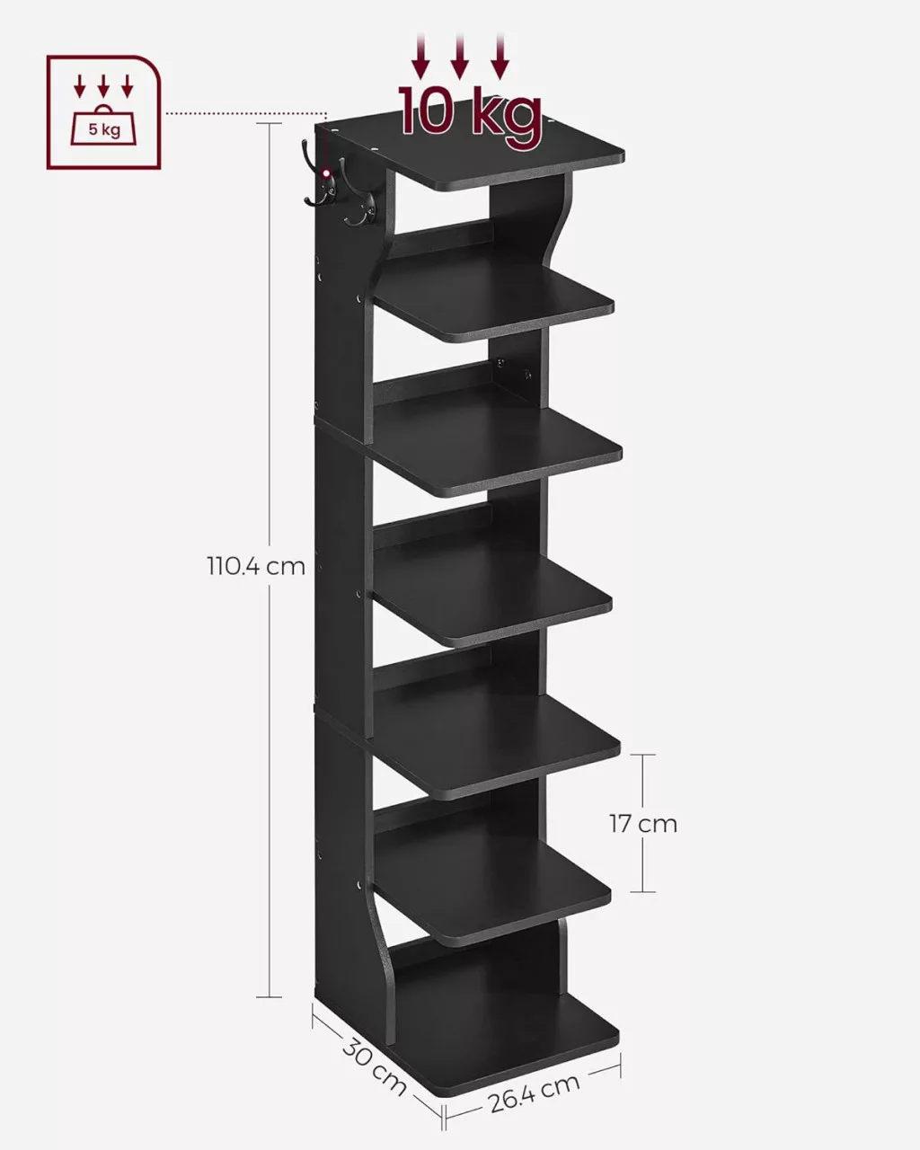 Kompakt, 6 szintes cipőtároló állvány praktikus akasztókkal, kifejezetten kis terekbe tervezve. Ideális megoldás akár 12 pár cipő rendezett tárolására.