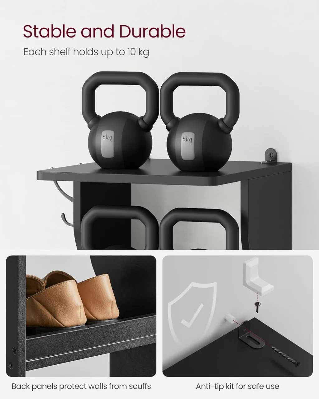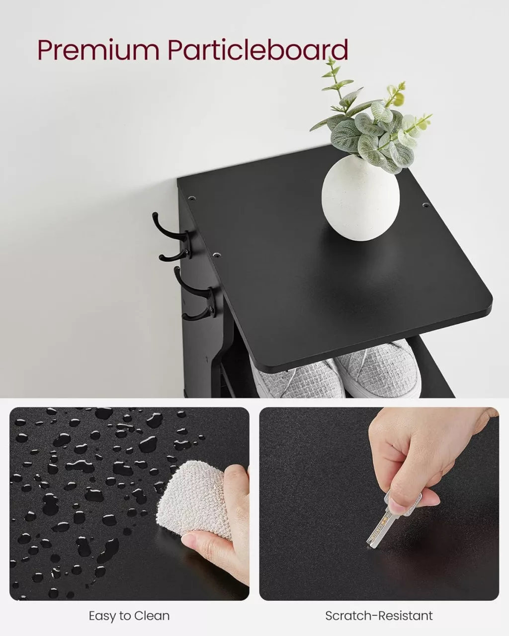Ez a karcsú cipőtároló állvány tökéletes megoldást nyújt a korlátozott térrel rendelkező otthonokban. A 110,4 cm magas torony 6 stabil polcával és oldalsó akasztóival maximálisan kihasználja a függőleges teret, miközben minimális alapterületet foglal.