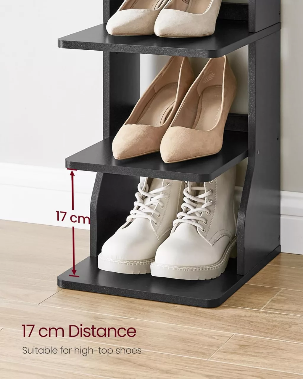 A polcok közötti 17 cm-es távolság lehetővé teszi magas szárú cipők és csizmák tárolását is. A fekete színű, fából készült szerkezet nem csak praktikus, de stílusos kiegészítője is lehet előszobájának vagy gardróbjának.