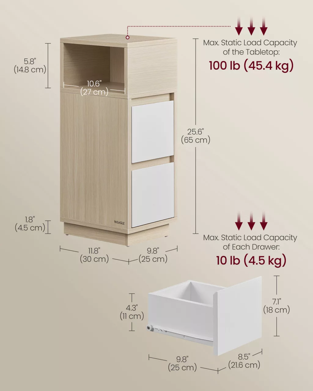 A VASAGLE keskeny éjjeliszekrény készlet a kis terek ideális megoldása. A 25 cm széles, karcsú kialakítás függőlegesen maximalizálja a tárolóhelyet anélkül, hogy értékes padlóterületet foglalna el. A természetes bézs színű, kéttónusú dizájn modern eleganciát kölcsönöz hálószobájának vagy napplijának, miközben a prémium forgácslap és MDF anyagok tartós minőséget garantálnak.