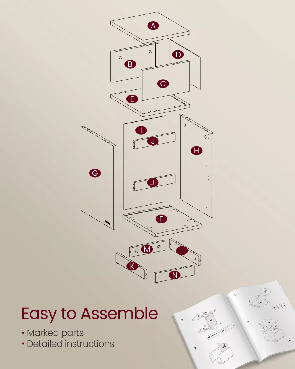 • Állítható nyitott rekesz: A felső rekesz flexibilis szerelési lehetősége lehetővé teszi, hogy az éjjeliszekrényt tökéletesen illeszthesse a helyiség elrendezéséhez és az ágy oldalához
