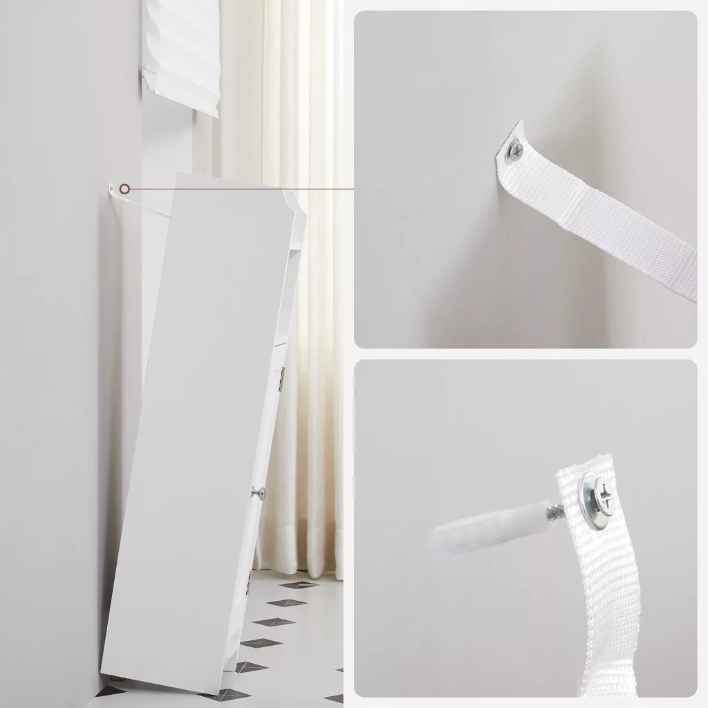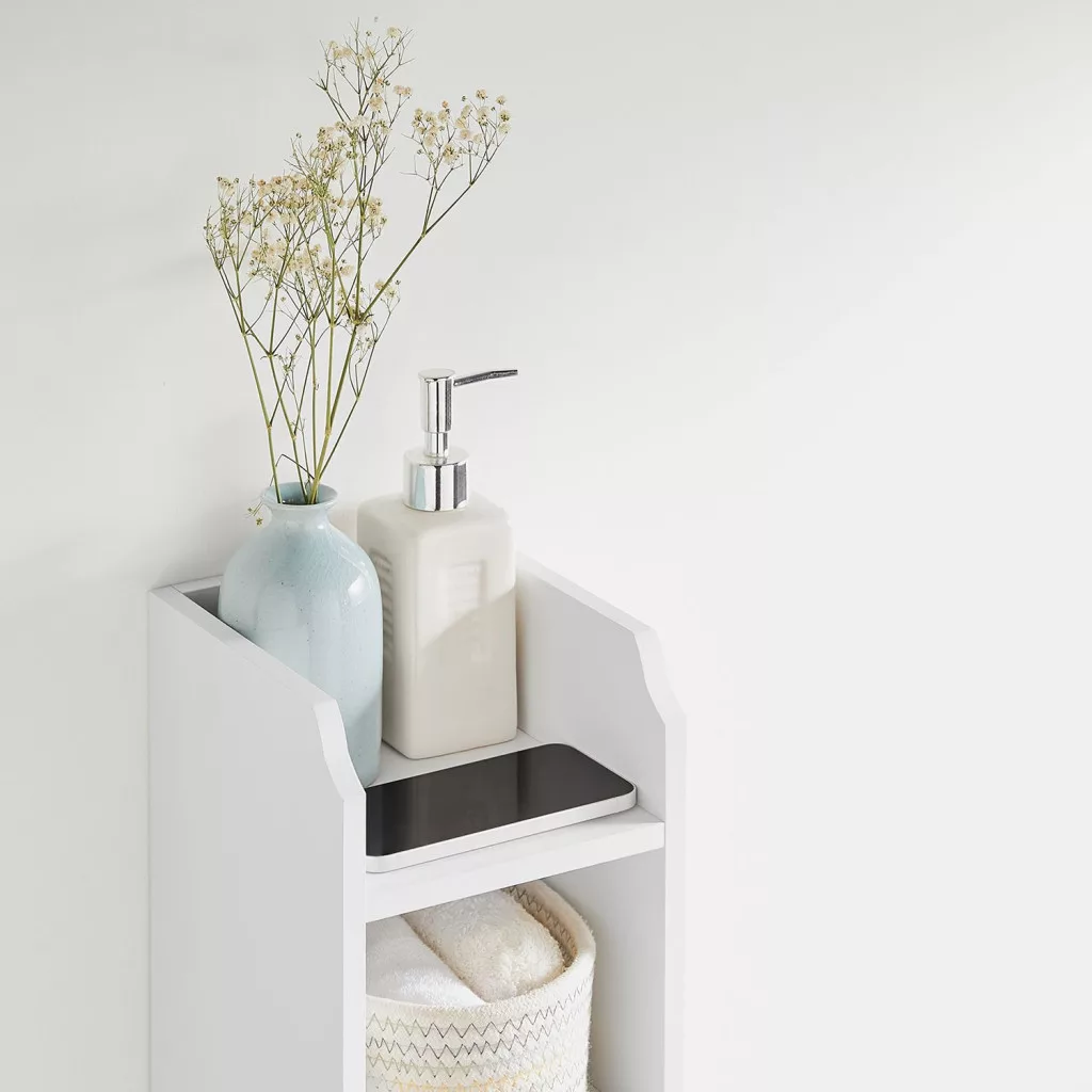 Ez a karcsú VASAGLE fürdőszobai szekrény ötvözi az elegáns megjelenést a praktikus funkcionalitással. A tiszta vonalvezetésű, fehér kivitelezésű bútor tökéletesen illeszkedik bármilyen fürdőszobai környezetbe. A nyitott polcok ideálisak dekorációs elemek vagy gyakran használt tárgyak tárolására.
