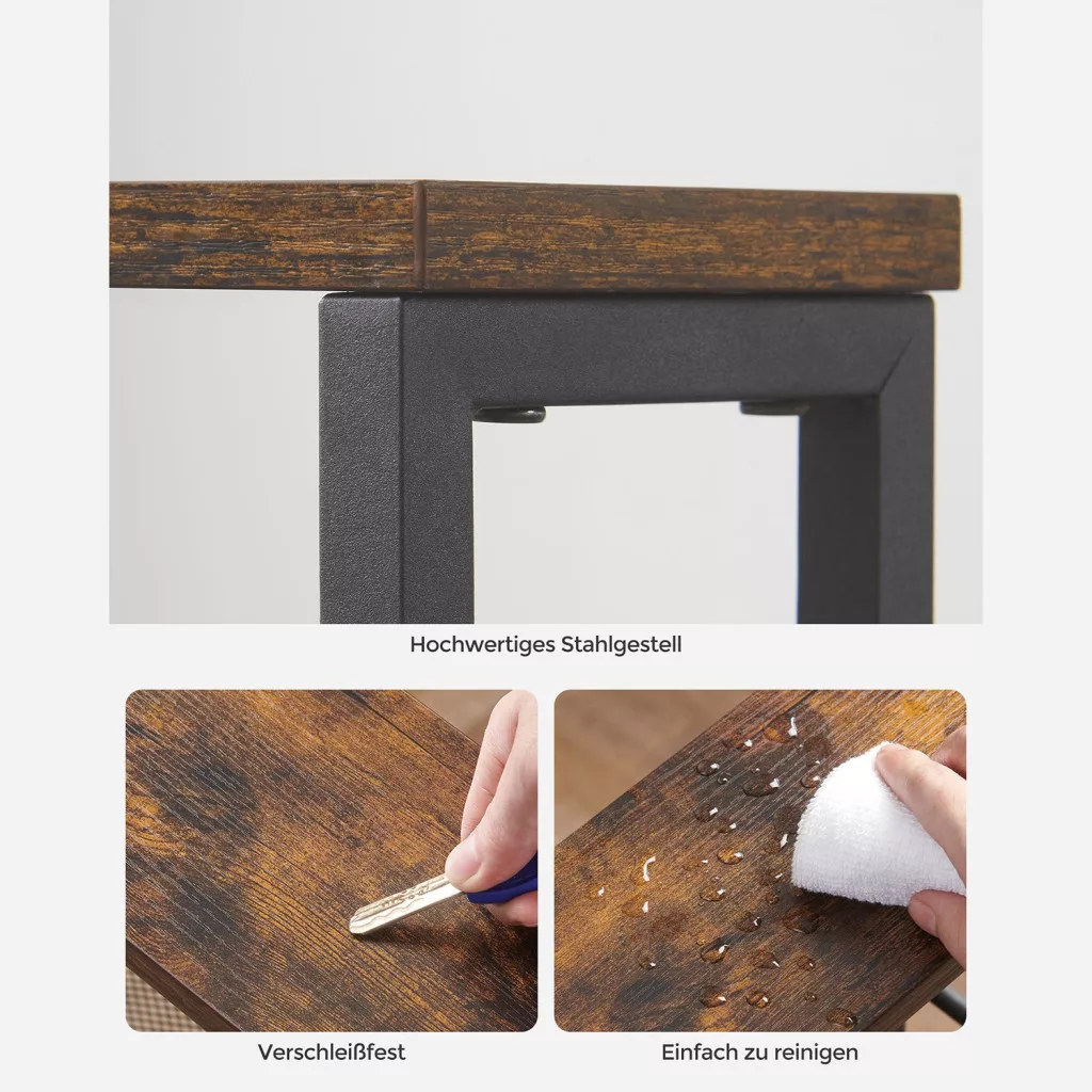 Ez a keskeny gurulós állvány tökéletes megoldást nyújt a szűk helyek kihasználására. A vintage barna fa hatású felső polc és a fekete acél váz elegáns industrial stílust kölcsönöz, míg a rácsos kialakítású tárolószintek biztonságosan megtartják a tárolt eszközöket.