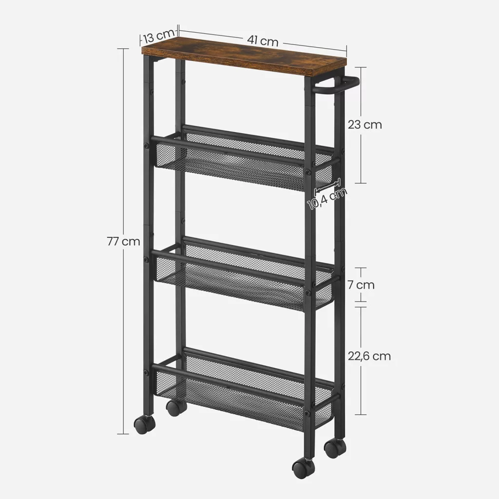 A mindössze 13 cm-es mélységének köszönhetően könnyedén elfér szűk helyeken is, például mosógép mellett vagy konyhapult végében. A 4 kerék és a praktikus fogantyú segítségével könnyedén mozgatható, így mindig oda gurítható, ahol éppen szükség van rá.