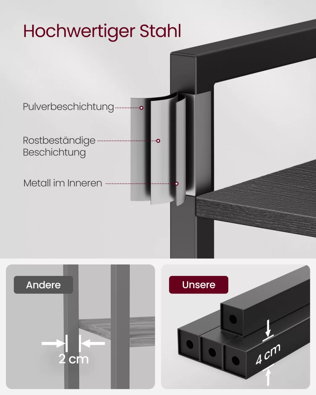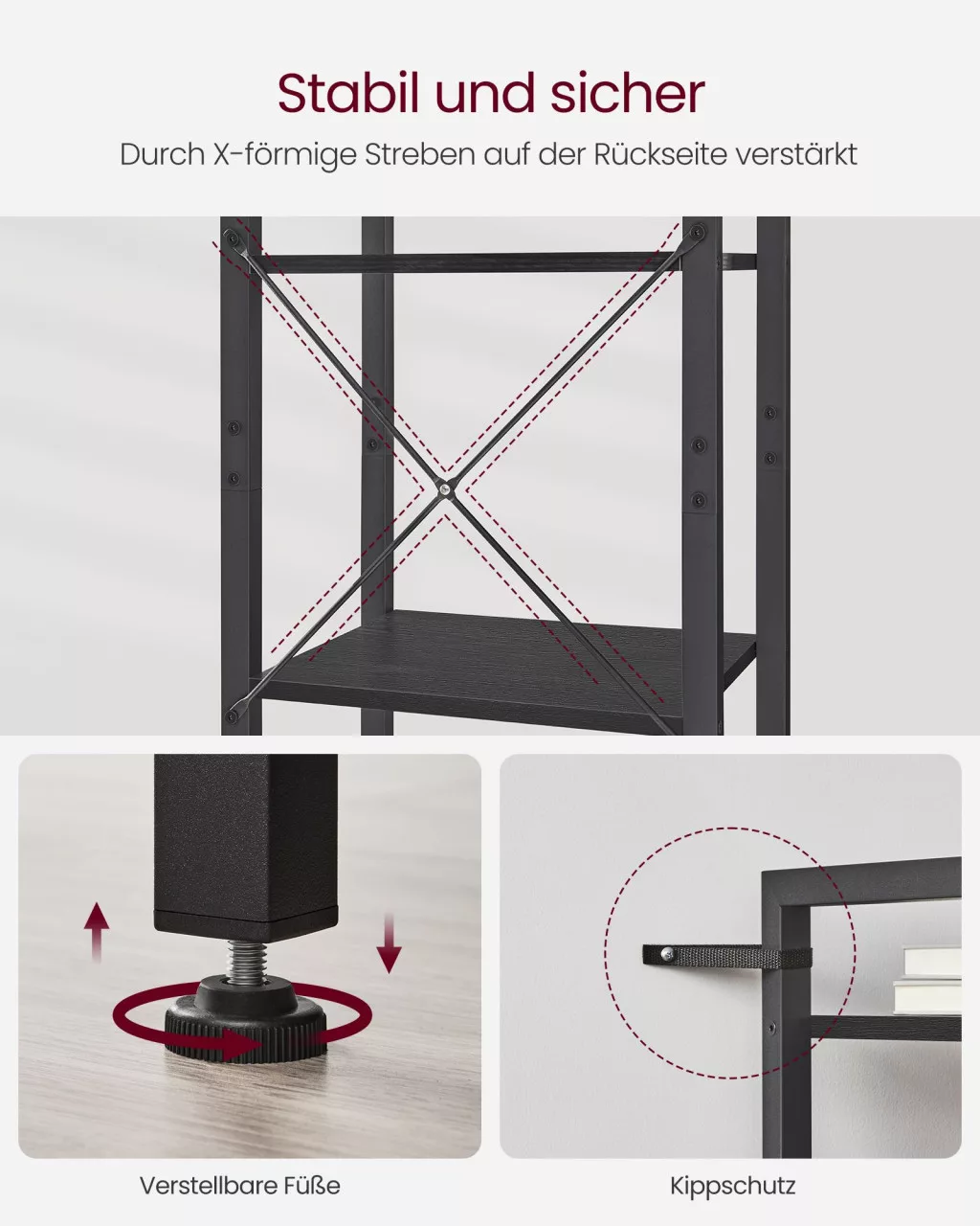 A minőségi faforgácslapból és stabil acélvázból készült polc minden szintje 8,3 kg terhelést bír el. Az X alakú merevítők és az állítható lábak garantálják a stabilitást, míg a falhoz rögzítő készlet extra biztonságot nyújt.