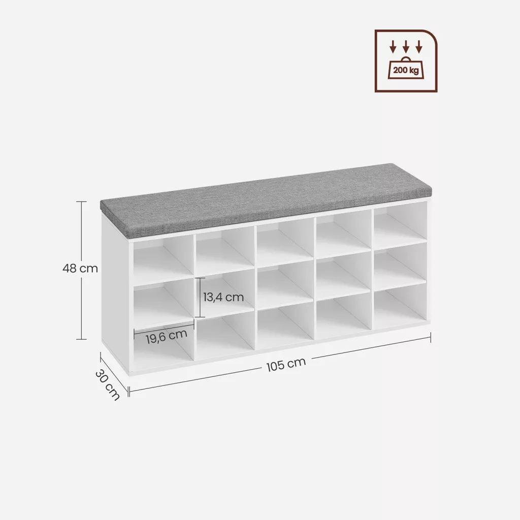 Elegáns és praktikus cipőtároló pad párnázott ülőfelülettel és 15 rekesszel, amely tökéletes megoldást nyújt az előszobai cipőtárolásra és kényelmes cipőfelvételre.