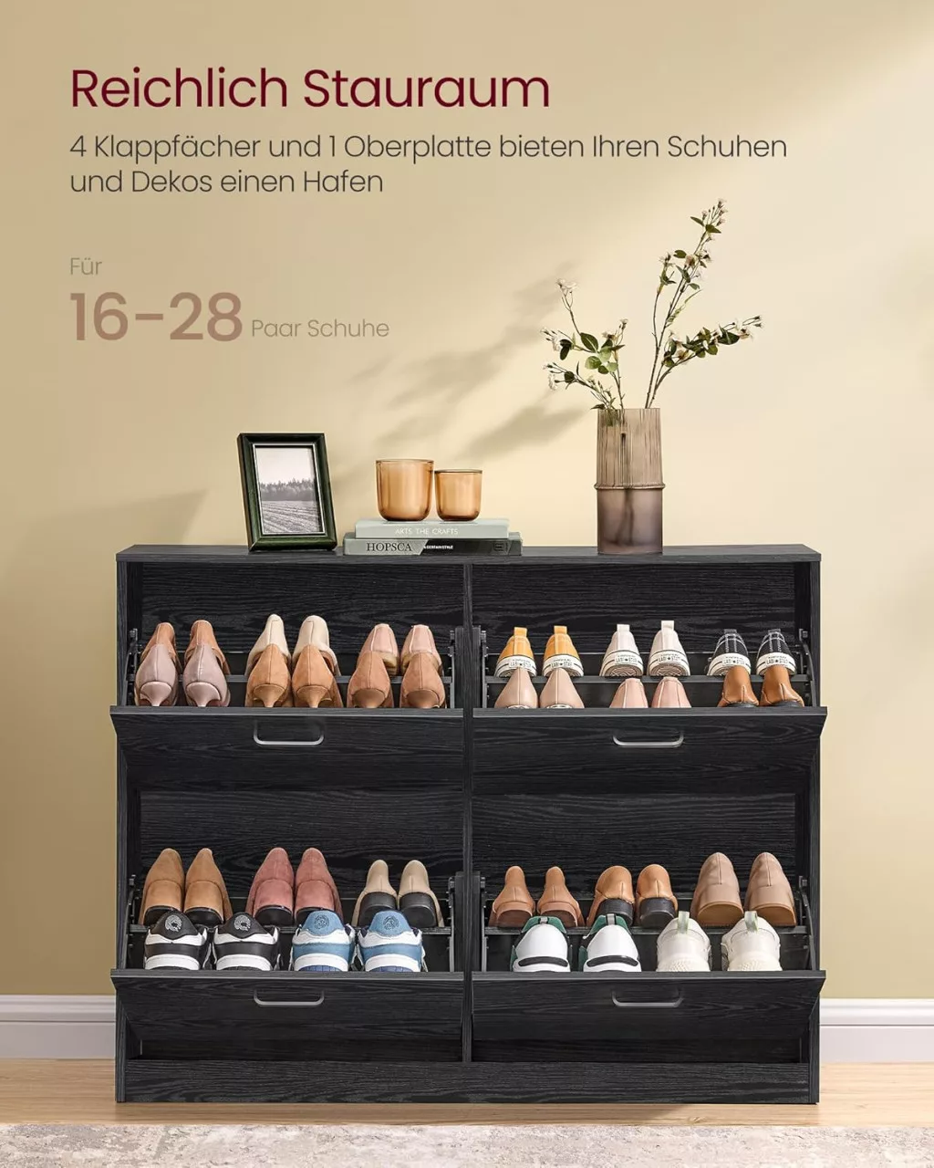 VASAGLE Kompakt Cipősszekrény 4 Billenő Ajtóval Ébenfa Fekete