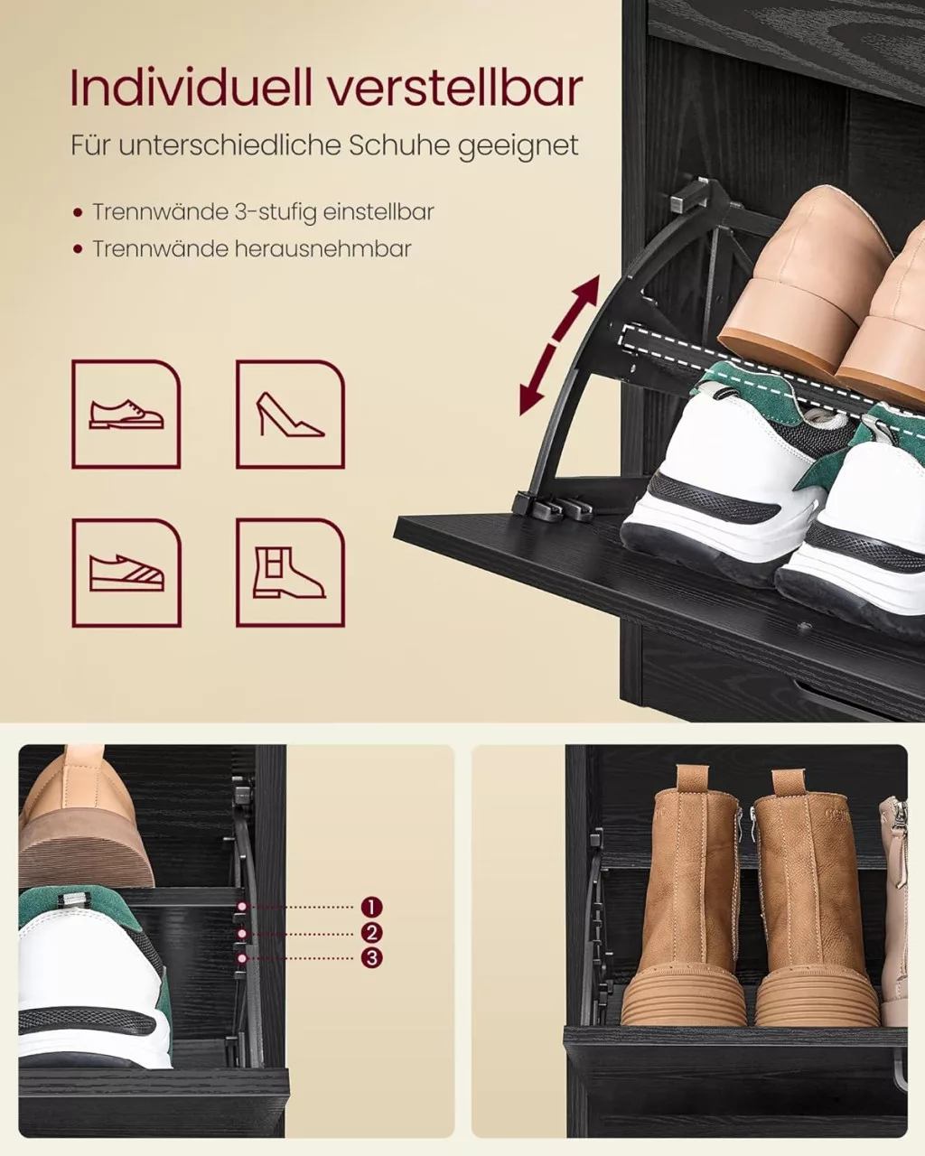 • Állítható polcok: Különböző méretű cipők tárolhatók