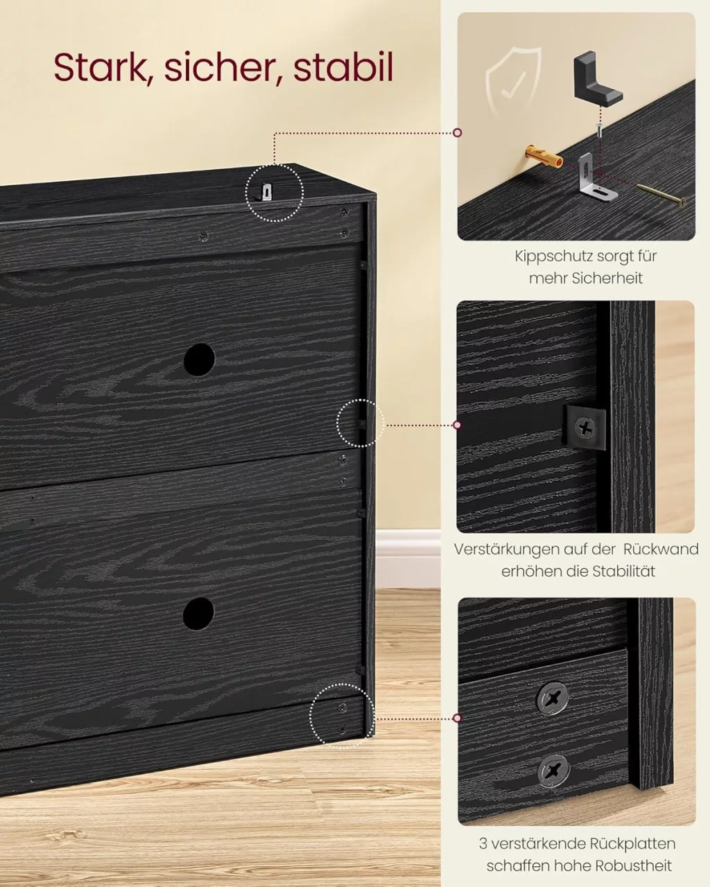 A prémium minőségű faforgácslapból készült bútor nem csak praktikus, de dekoratív is - a felső lapja ideális felület növények, képkeretek vagy egyéb dísztárgyak elhelyezésére. A szekrény stabil szerkezete és a mellékelt dőlésgátló hosszú élettartamot biztosít.
