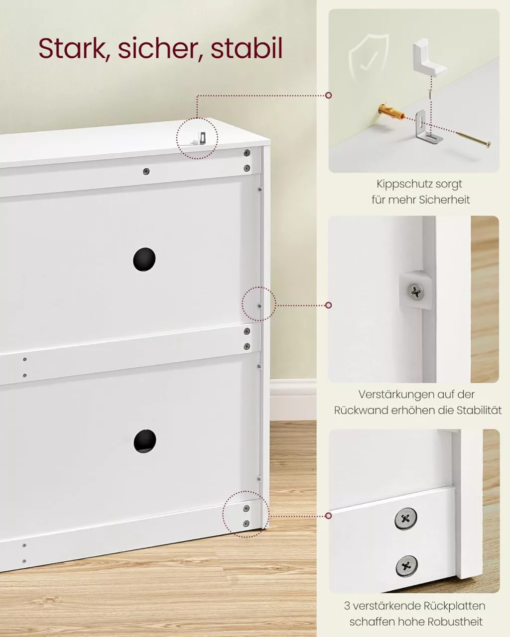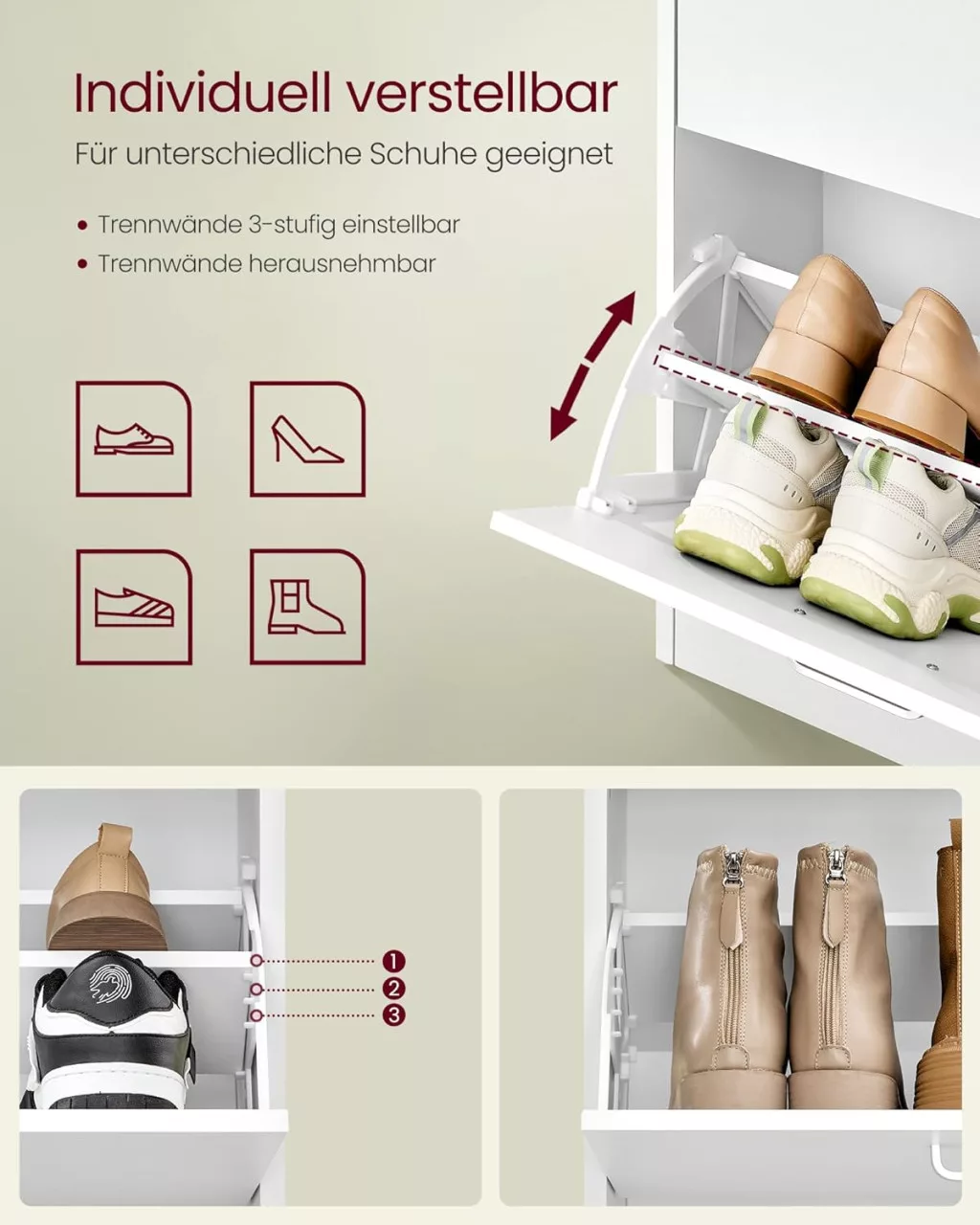 A rekeszek magassága 3 különböző pozícióba állítható, így minden méretű cipőt kényelmesen tárolhat. A prémium minőségű faforgácslapból készült bútor stabil szerkezetű, dőlésgátlóval felszerelt, és könnyen tisztítható hófehér felülettel rendelkezik.