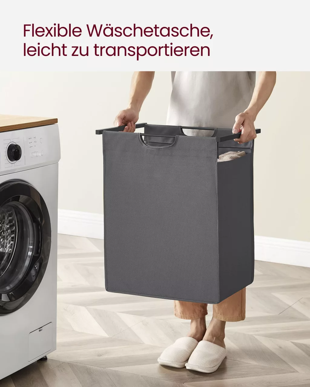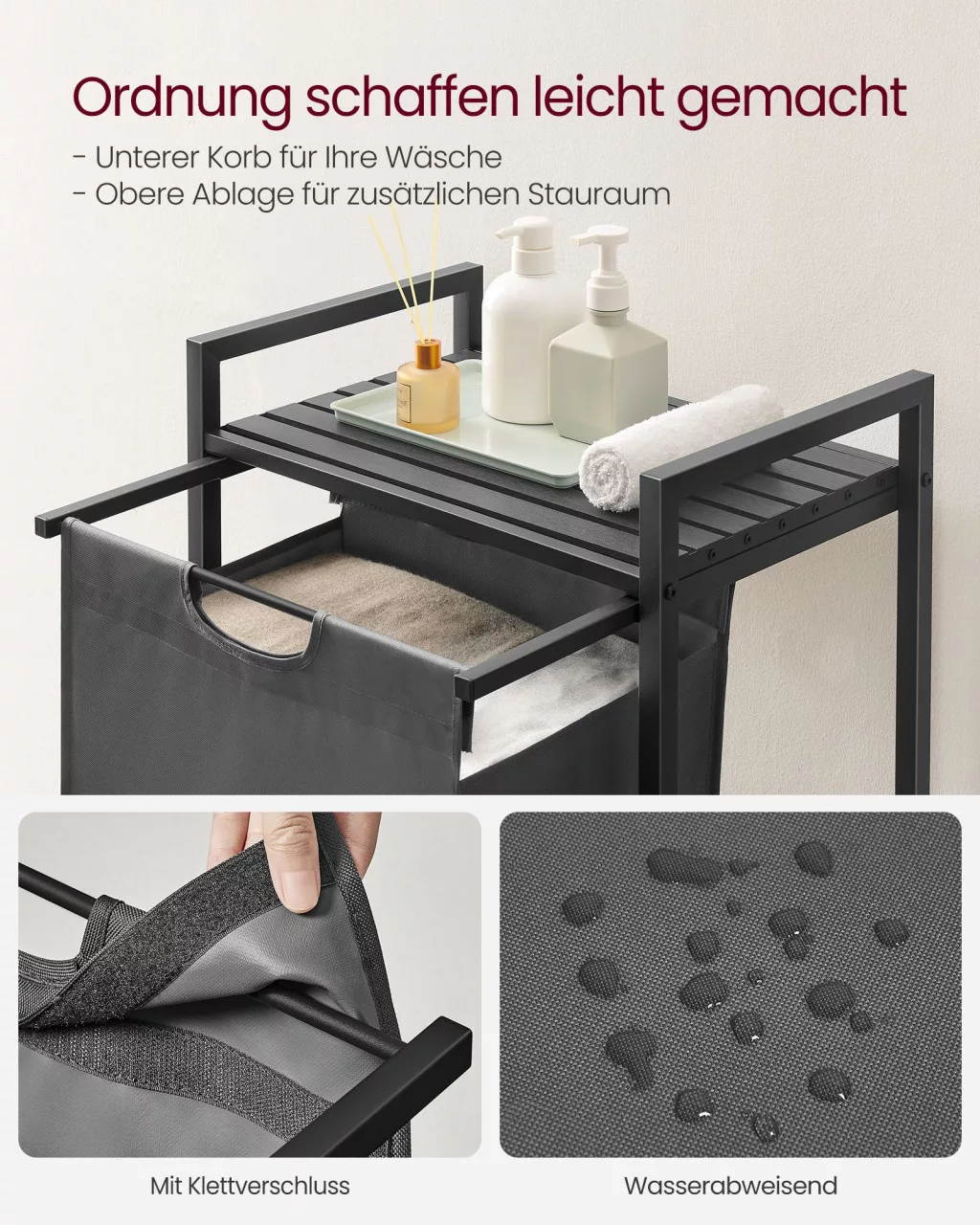 Ez a modern szennyestartó ötvözi a funkcionalitást és a stílusos megjelenést. A 65 literes kapacitású, kivehető zsák könnyedén szállíthatóvá teszi a szennyest, míg a felső polc extra tárolóhelyet biztosít mosószerek és egyéb kellékek számára.