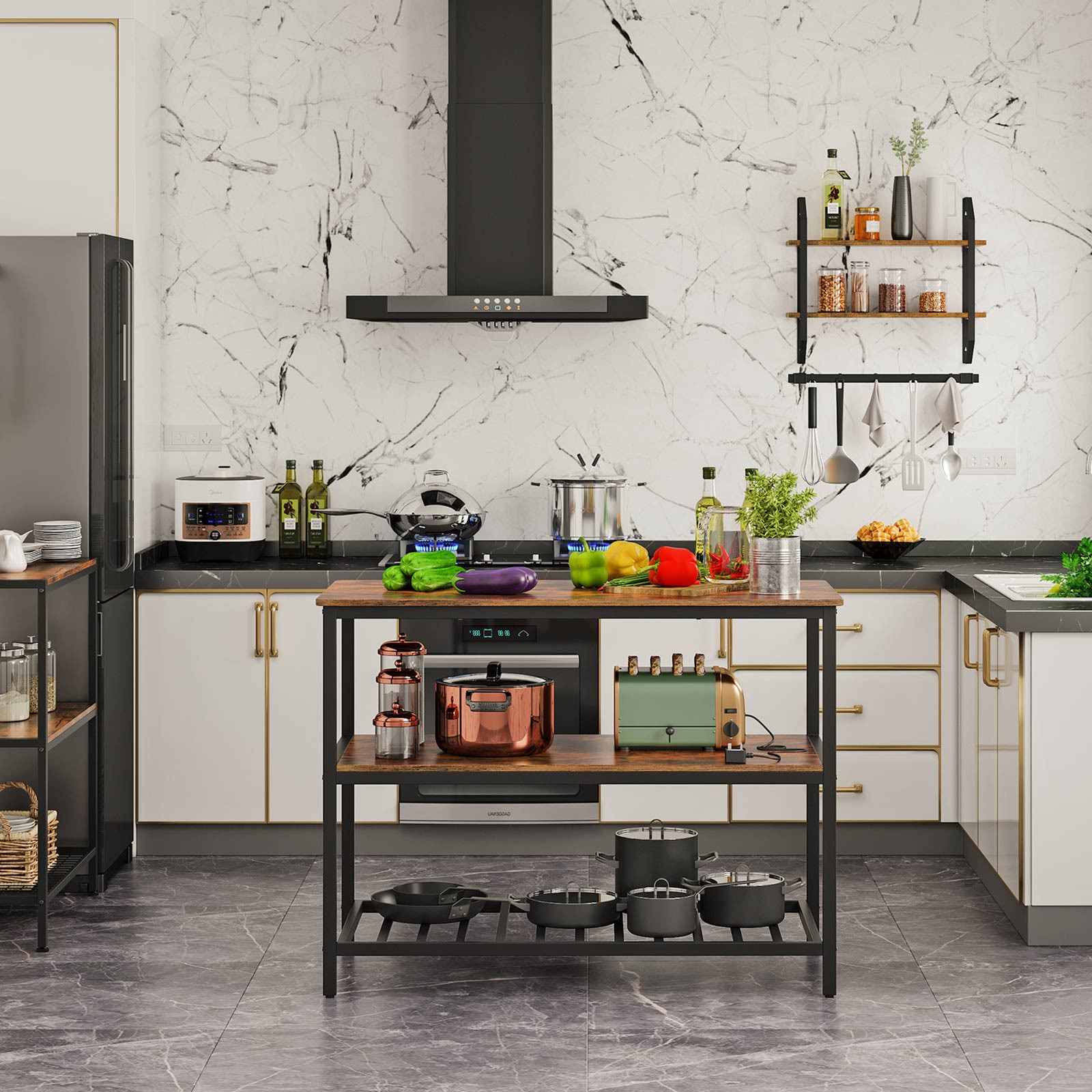 Ez a VASAGLE konyhasziget tökéletes megoldás azok számára, akik több munkaterületre és tárolóhelyre vágynak konyhájukban. A 120 x 60 cm-es tágas munkalap ideális sütemények készítéséhez, pizza sütéséhez vagy akár családi főzéshez. A rusztikus barna színű polcok és a matt fekete acélváz harmonikus kontrasztja ipari hangulatot teremt, miközben tartós és stabil konstrukciót biztosít.