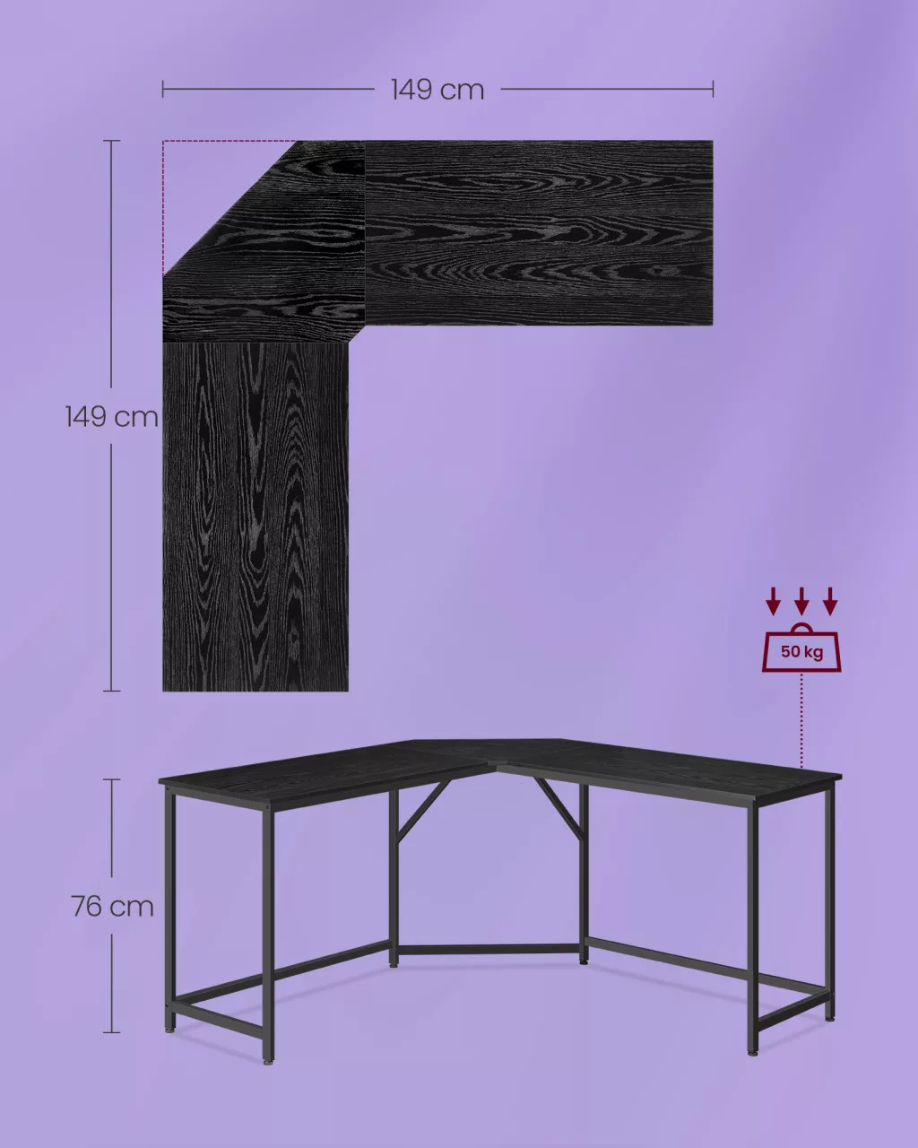 Ez az L-alakú íróasztal tökéletesen ötvözi a praktikumot és a modern dizájnt. A 149 x 149 cm-es munkafelület bőséges helyet biztosít akár több monitor, számítógépes kiegészítők és irodai kellékek számára. A robusztus acél váz és a minőségi faforgácslap lap stabil alapot nyújt mindennapi használatra.