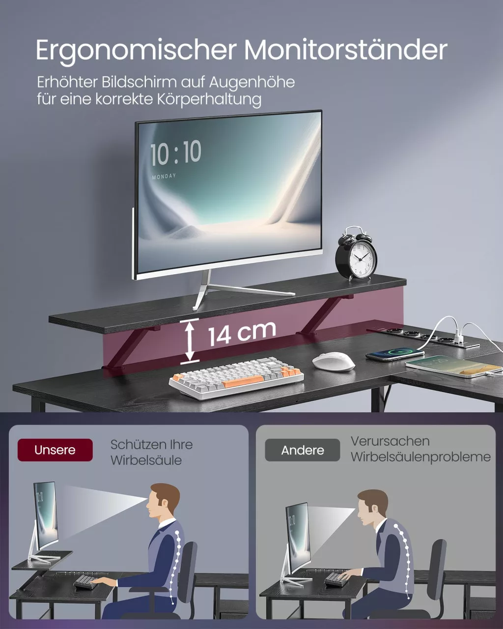VASAGLE L-alakú Gamer Íróasztal LED Világítással és Monitortartóval Fekete LWD095B01