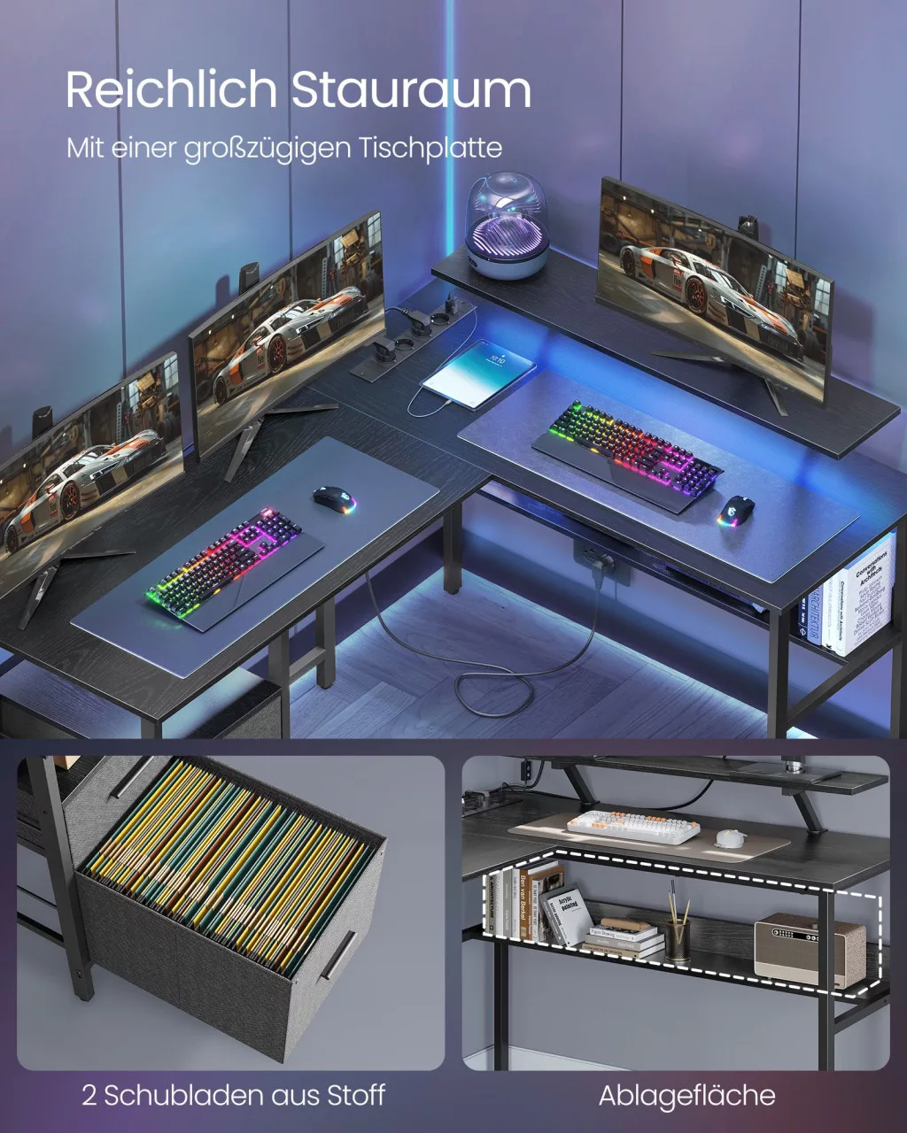 Modern L-alakú gamer íróasztal beépített LED világítással, monitortartóval és töltési lehetőségekkel, amely tökéletes választás játékosok és otthoni irodák számára.