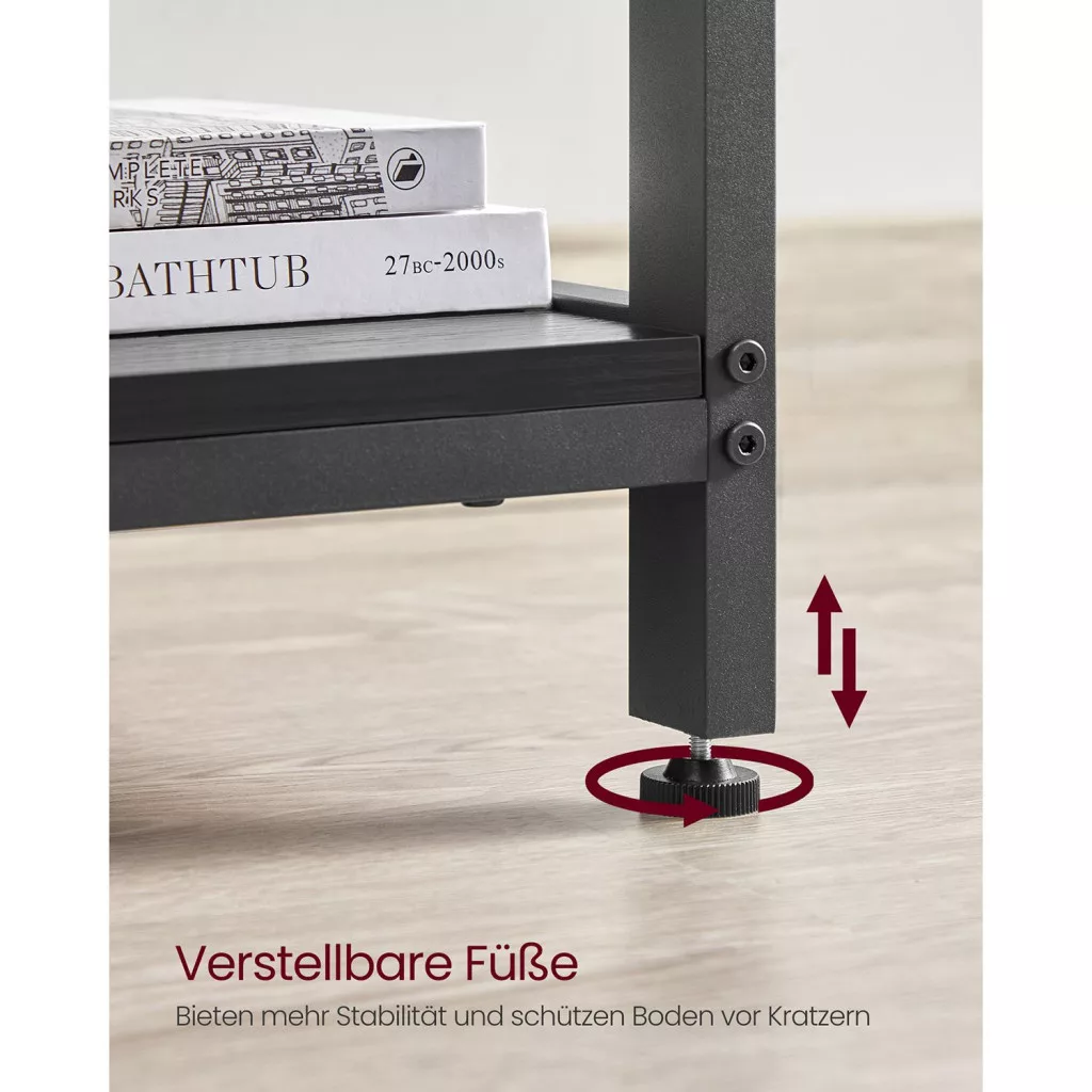 A robusztus acélváz és a minőségi faforgácslap kombináció tartós stabilitást biztosít, míg az állítható lábak tökéletes egyensúlyt teremtenek egyenetlen padlón is. A kábelrendező kivágás a sarokban segít rendben tartani az elektronikai eszközök vezetékeit.