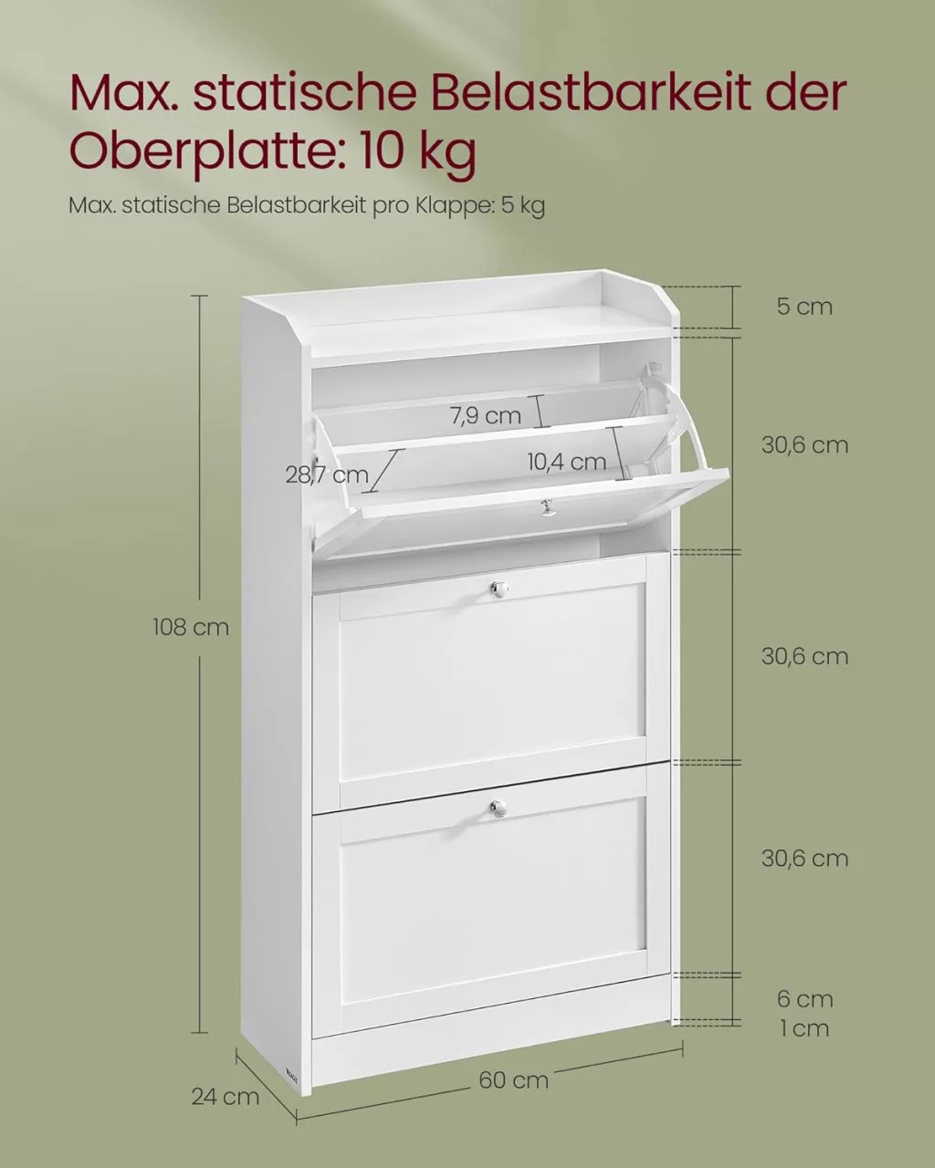 A szekrény felső lapja nem csupán dekoratív elem – akár 10 kg terhelhetőségével tökéletes hely növényeknek, képkereteknek vagy kulcstartó tálcának. A hátsó panel védelmet nyújt a por és rovarok ellen, míg a mellékelt falbilincses rögzítés garantálja a biztonságos használatot. Az állítható válaszfalaknak köszönhetően a belső tér személyre szabható, így különböző cipőtípusok is kényelmesen elférnek benne.