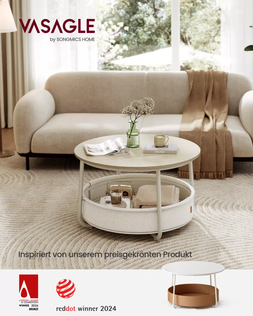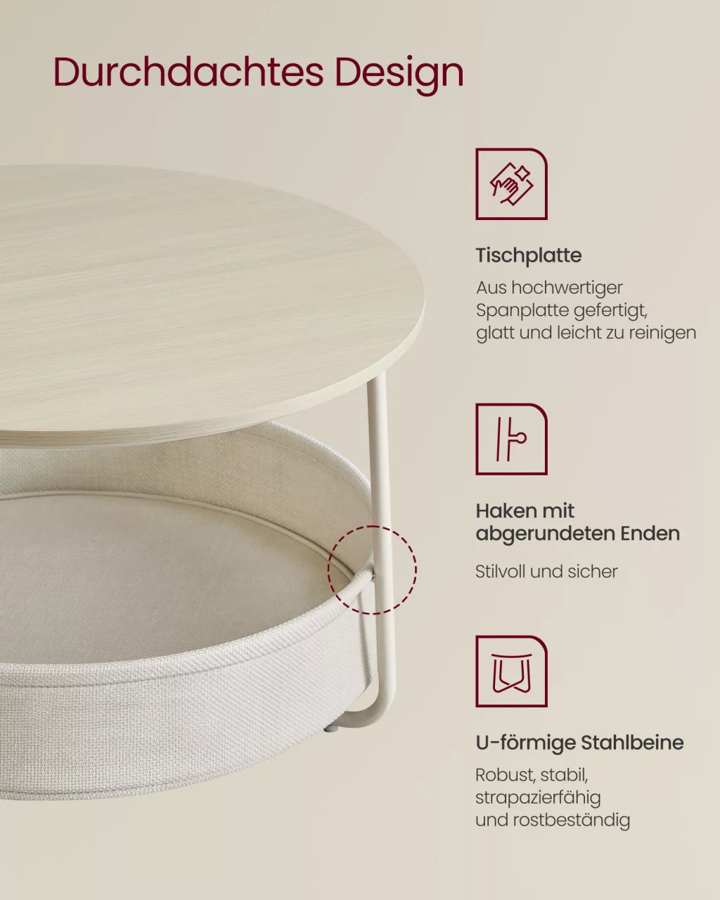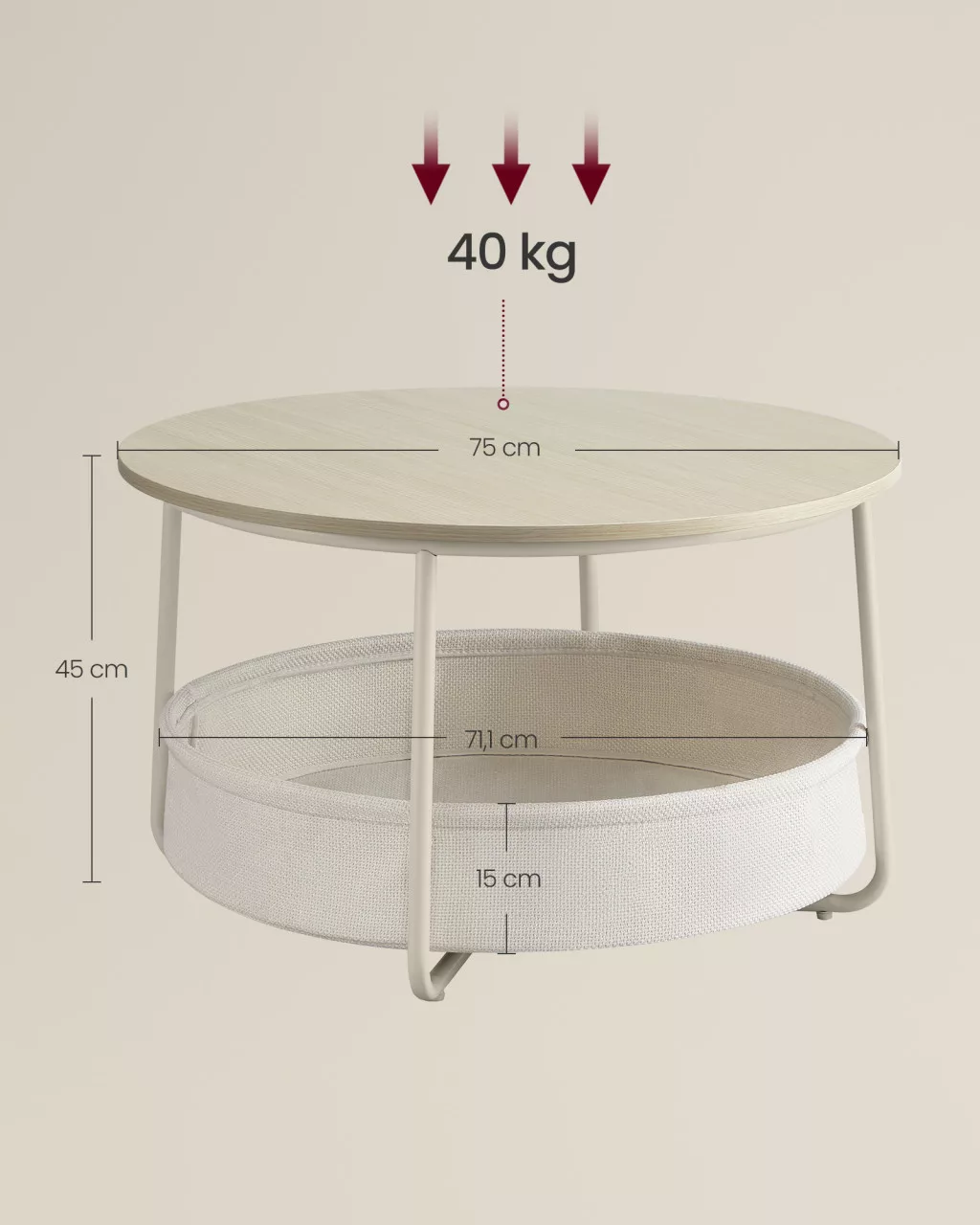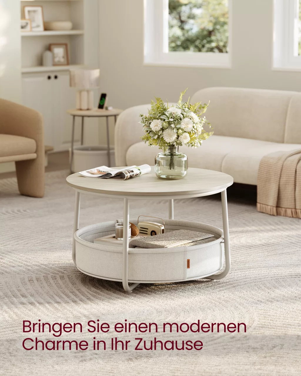 VASAGLE LCT244K01 Kerek Dohányzóasztal Tárolóhellyel Természetes Bézs/Krémfehér
