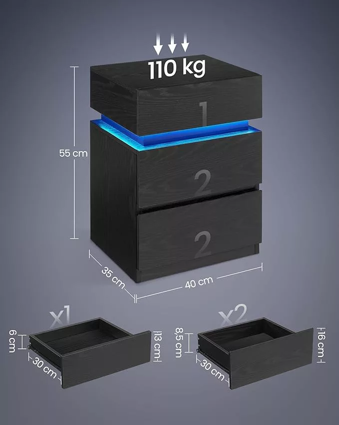Ez a modern éjjeliszekrény egyesíti a praktikus tárolást és a dekoratív világítást. A 25 különböző színben állítható LED csík egyedi hangulatot teremt, míg a három tágas fiók bőséges helyet biztosít személyes tárgyainak. A 15 mm vastag faforgácslapból készült bútor stabil szerkezettel és 110 kg-os teherbírással rendelkezik.