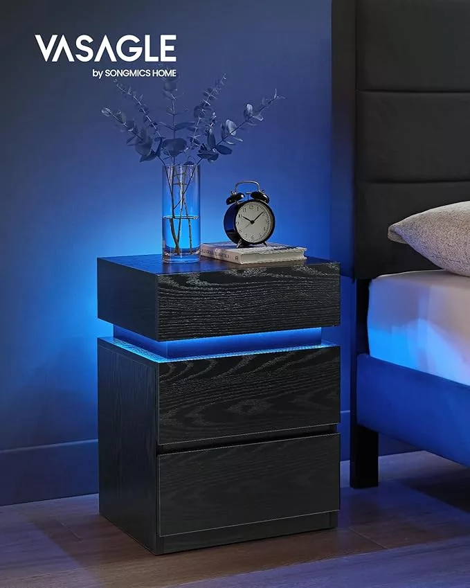 VASAGLE LED Világításos Éjjeliszekrény Fekete Faerezetes