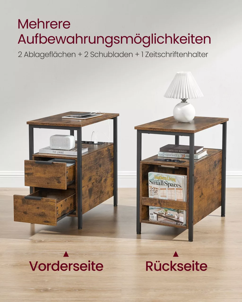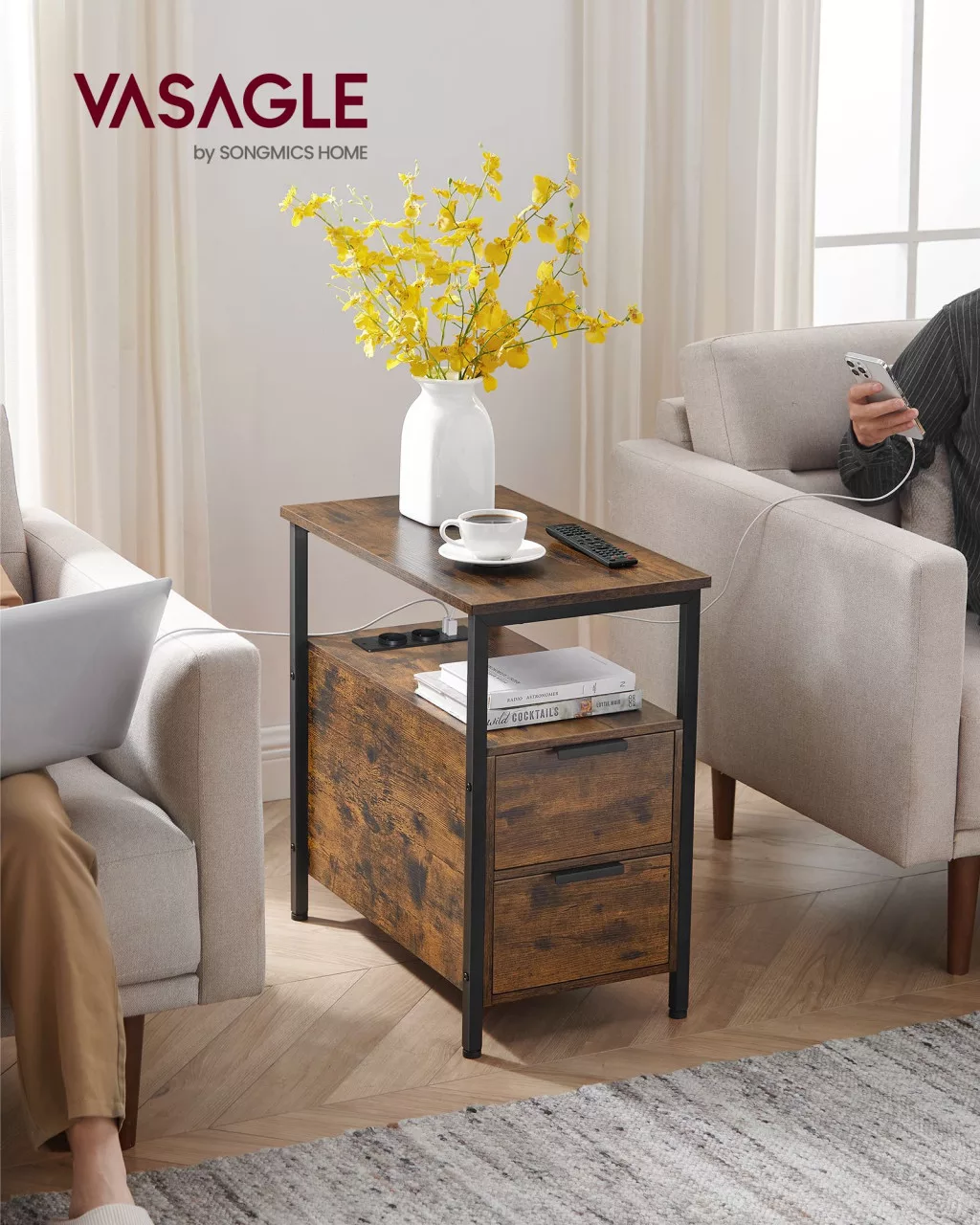 VASAGLE LET325B01 oldalsó asztal beépített elosztóval 2 fiókkal vintage barna
