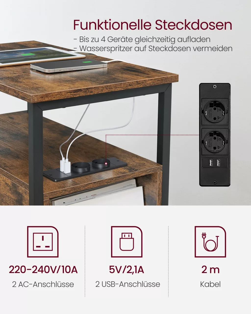 A VASAGLE oldalsó asztal a funkcionalitás és a stílus tökéletes ötvözete. A beépített elosztó 2 AC és 2 USB porttal lehetővé teszi eszközei kényelmes töltését, miközben a 2 méteres kábel elegendő mozgásteret biztosít. Az asztal kompakt mérete ellenére bőséges tárolóhelyet kínál: 2 fiók eltávolítható rekeszekkel, 2 nyitott polc a gyakran használt tárgyakhoz, valamint egy praktikus magazintartó a hátoldalon.