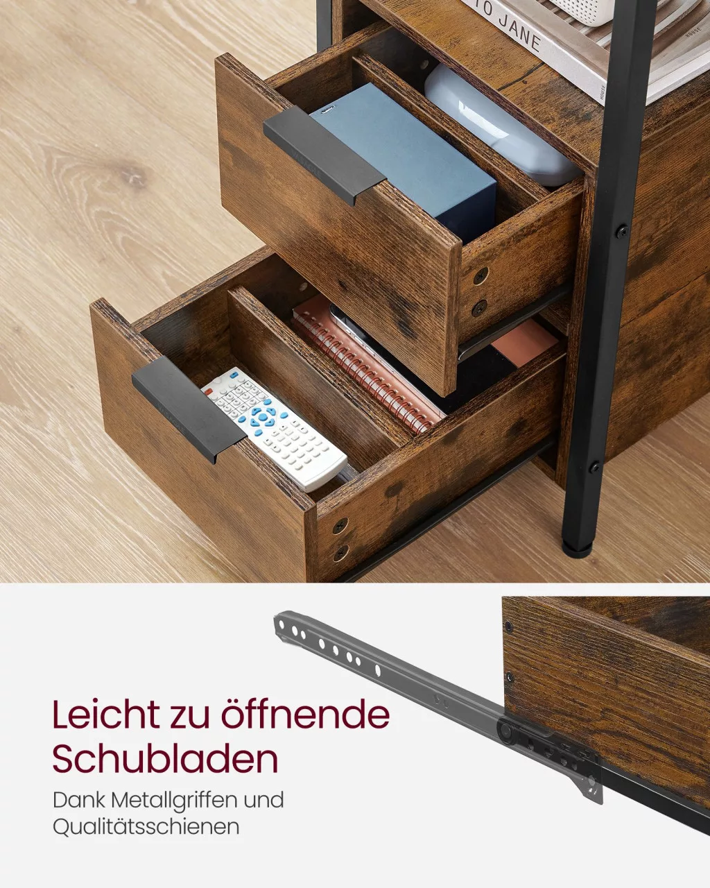 A masszív acél váz és fa forgácslap kombinációja kiváló stabilitást és tartósságot garantál, akár 90 kg terhelést is elbír. A prémium minőségű sínek biztosítják a fiókok sima kihúzását, míg a felső fogantyúk megkönnyítik az asztal mozgatását. A vintage barna szín és a rusztikus dizájn egyedi hangulatot teremt nappaliban, hálószobában vagy bármely helyiségben, ahol szükség van egy stílusos és praktikus bútordarabra.