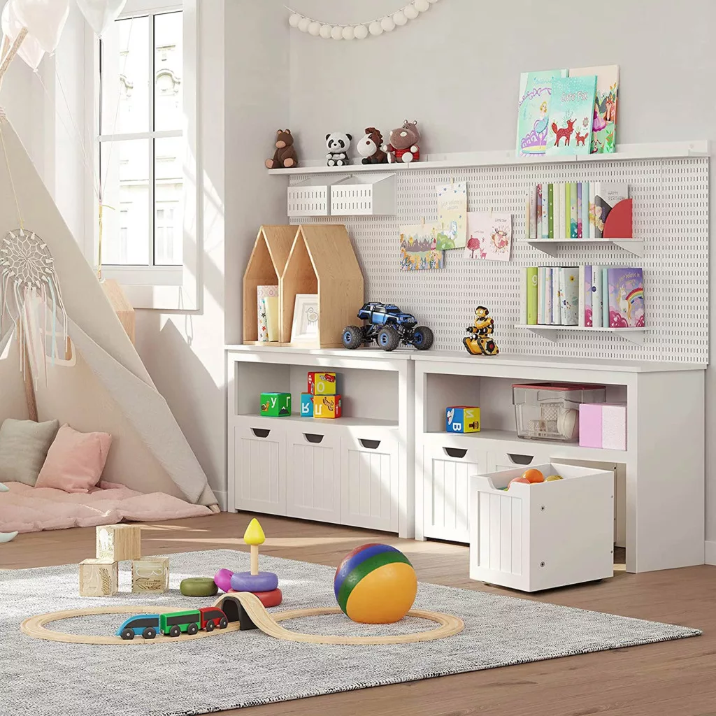 • Kihúzható tárolók kerekekkel: A három tároló könnyedén mozgatható, így a gyerekek önállóan rendezhetik el játékaikat, ami fejleszti a felelősségérzetüket és a rendszeretetet.