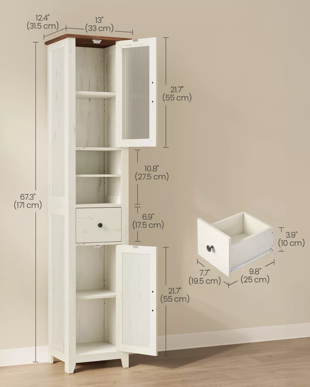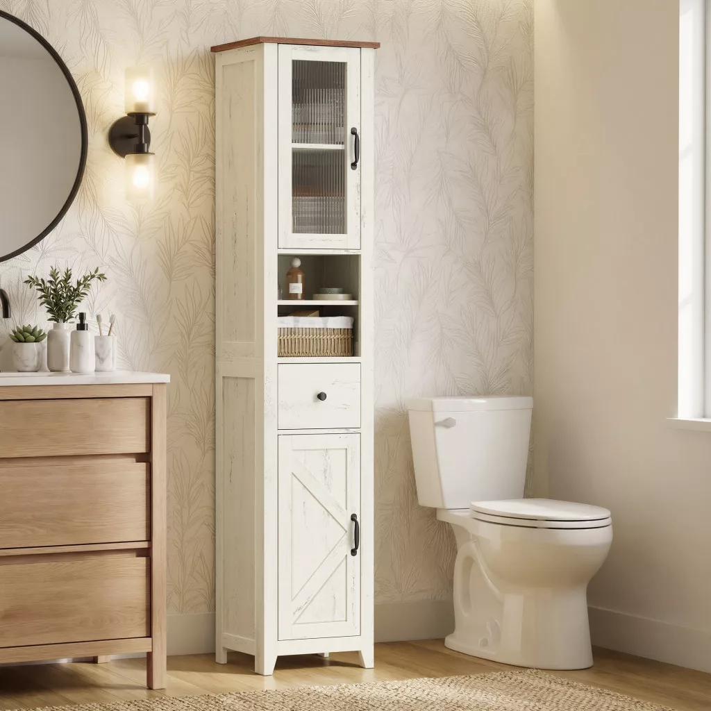 A VASAGLE LIRY kollekció fürdőszobaszekrénye a modern farmhouse stílus megtestesítője: rusztikus fehér színe, mézesbarna teteje, bemélyített panelei és karcsúsodó lábai meleg, otthonos hangulatot teremtenek. Ez a vékony, magas szekrény (31,5 x 33 x 171 cm) ideális kis fürdőszobákba, ahol minden centiméter számít. Két nyitott polcával, egy fiókjával és négy, ajtók mögötti rekeszével bőséges tárolóhelyet kínál anélkül, hogy sok helyet foglalna.