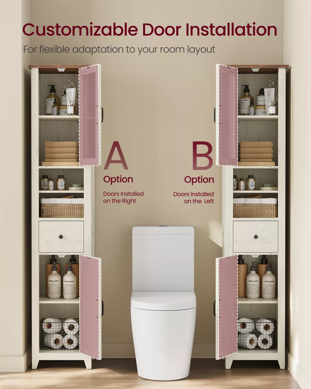 • Állítható ajtószerelés: A bal vagy jobb oldali felszerelhetőség lehetővé teszi, hogy a szekrényt a fürdőszoba elrendezéséhez igazítsa az optimális használat érdekében